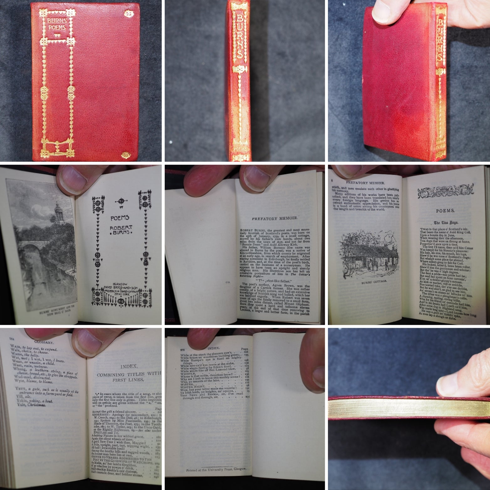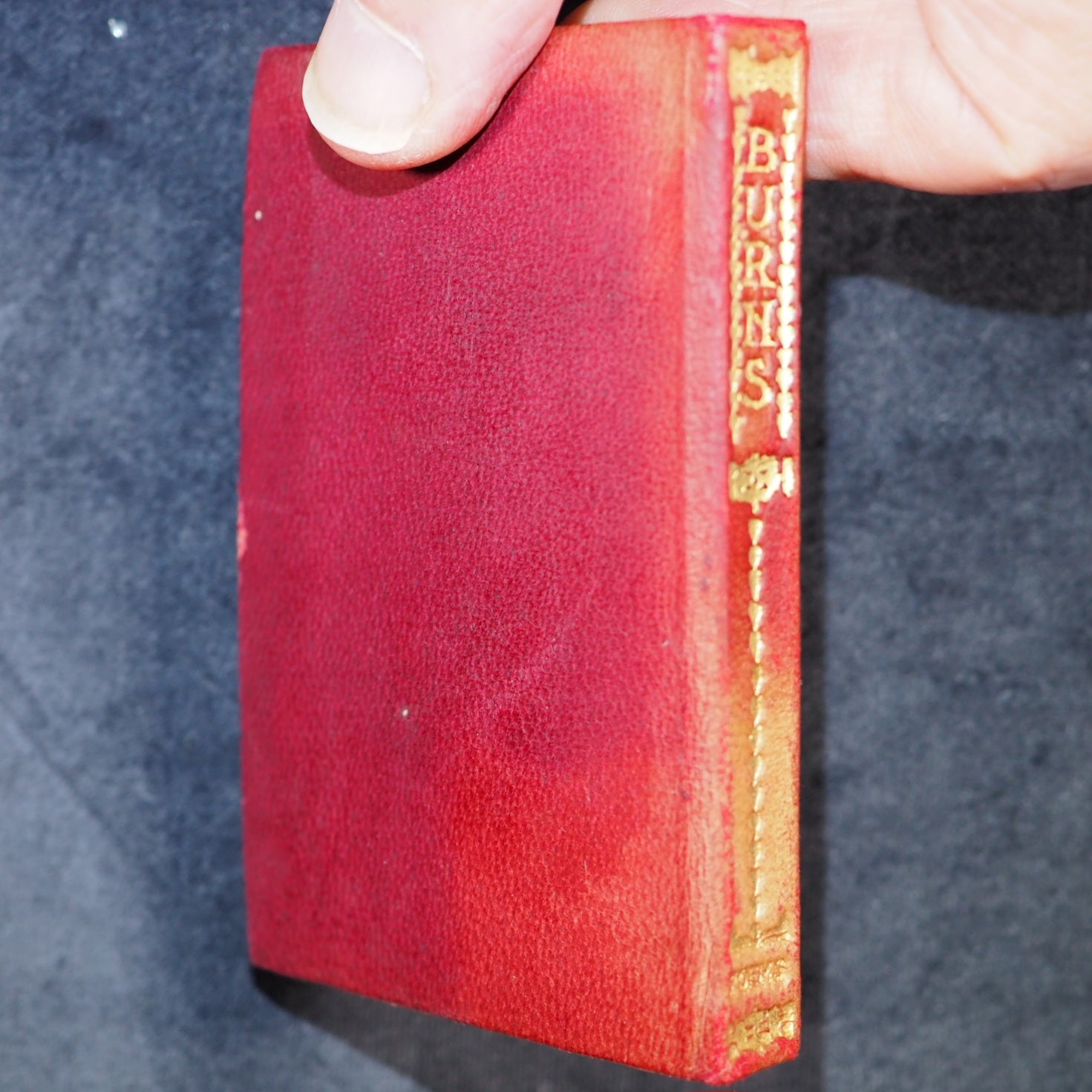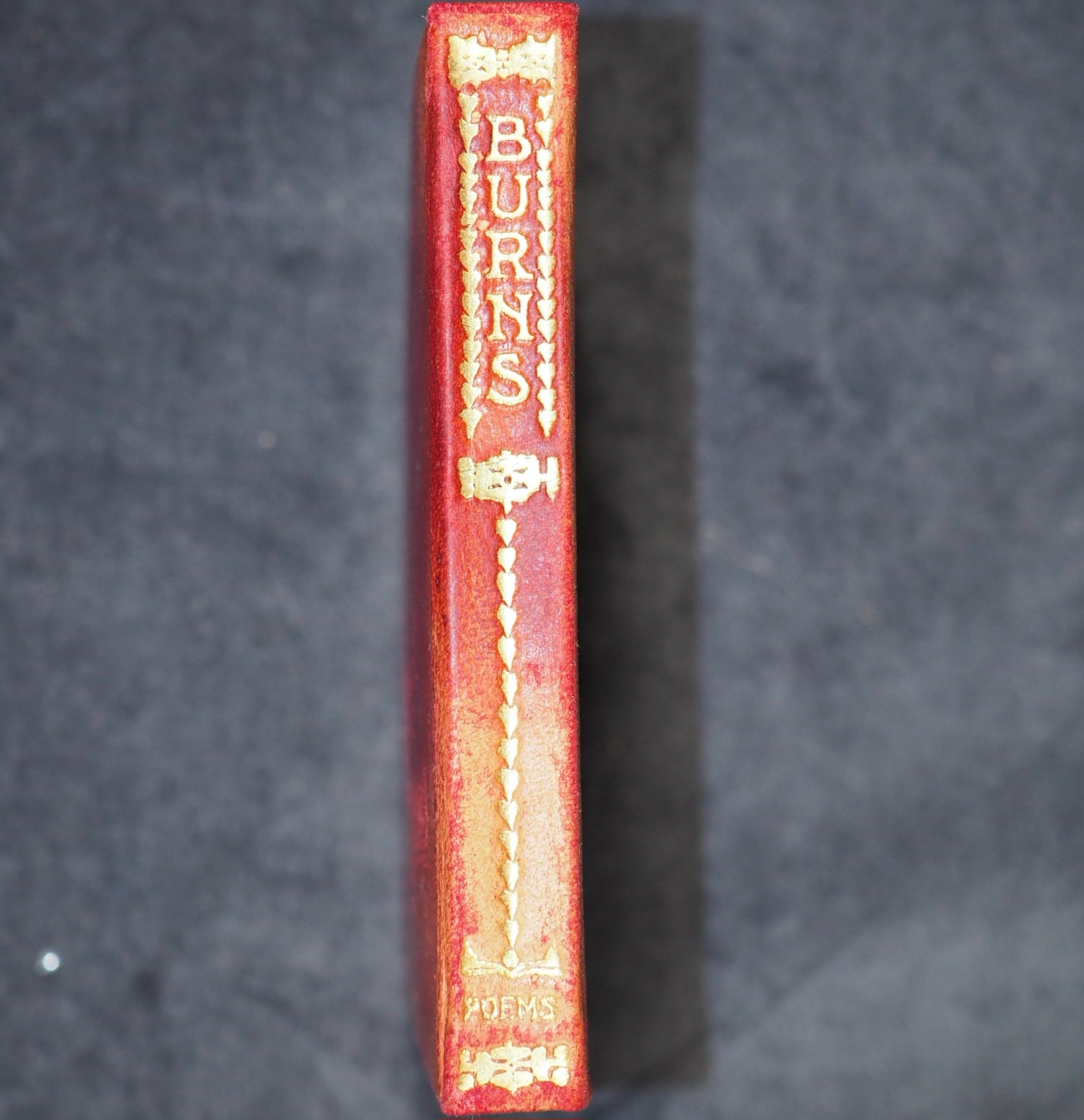 Burns, Robert. Poems. A choice selection from his works, serious and comic. Bryce & Son. Glasgow. 1889. Circa 1889. 272 printed pages. Frontispiece. Binding design & title page by Jessie M King. Dainty Little Library series, 24. Original black endpapers. 60 x 90 mm. Original publisher's burgundy calf. Gilt lettering within art nouveau style decorative borders. The Dainty Little Library saw Bryce re-packaging around thirteen or so classics from the Golden Thoughts and Tartan Series, with art-nouveau re-designed title pages and bindings by Jessie Marion King (1875-1949), a Scottish female children’s book illustrator of high esteem. Volumes 1-5 were Lord Tennyson’s works. 6 and 7 were by Walter Scott. 8 and 9 were Robert Burns title. 10 to 12 were by Wordsworth, Thomas Moore, and Macaulay respectively. All in attractive limp leather bindings of harlequin colours. Garbett, 49. Welsh, 1536. WorldCat locates no copies of the Dainty Little Library edition, worldwide. 47 firsts2024