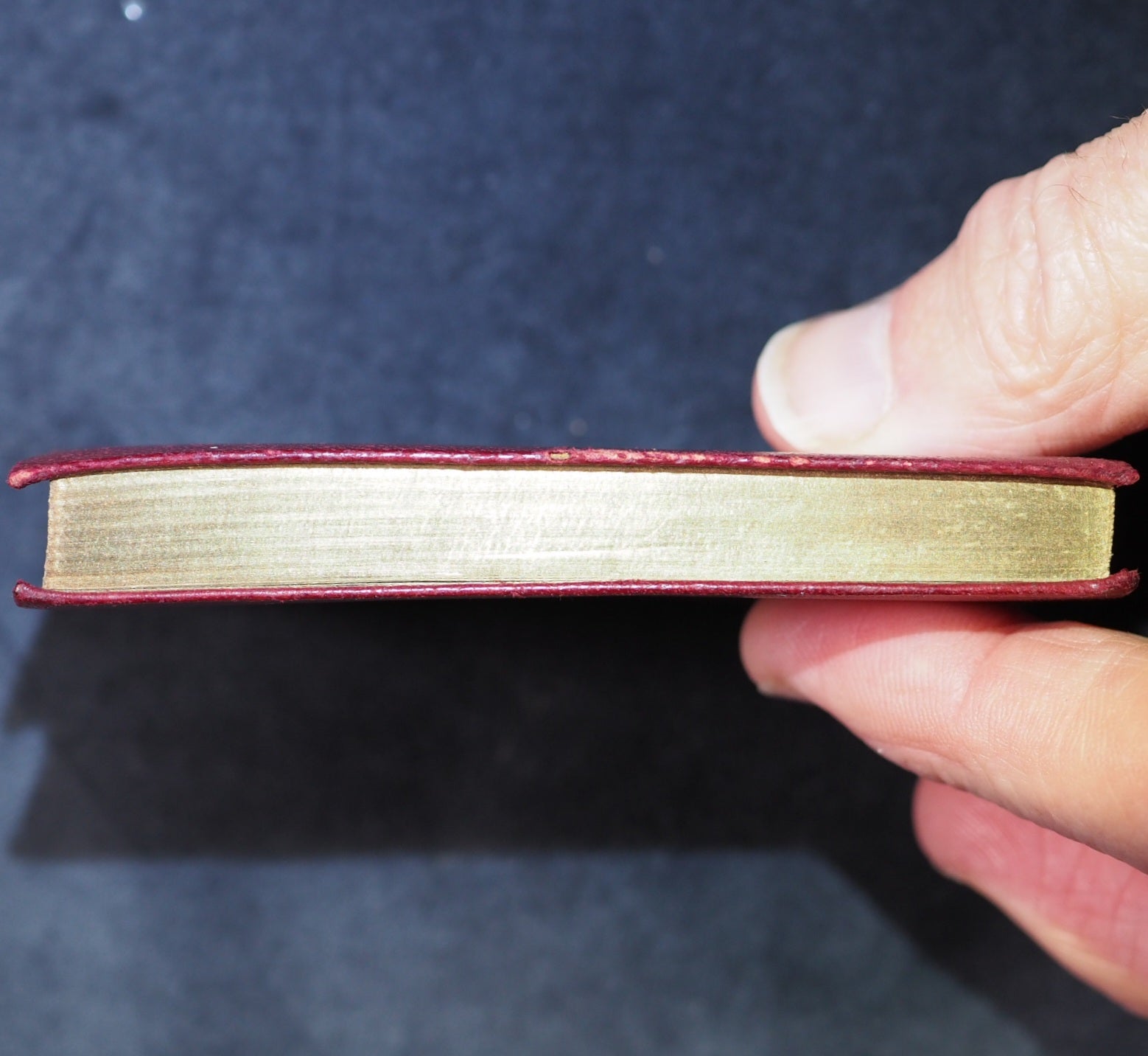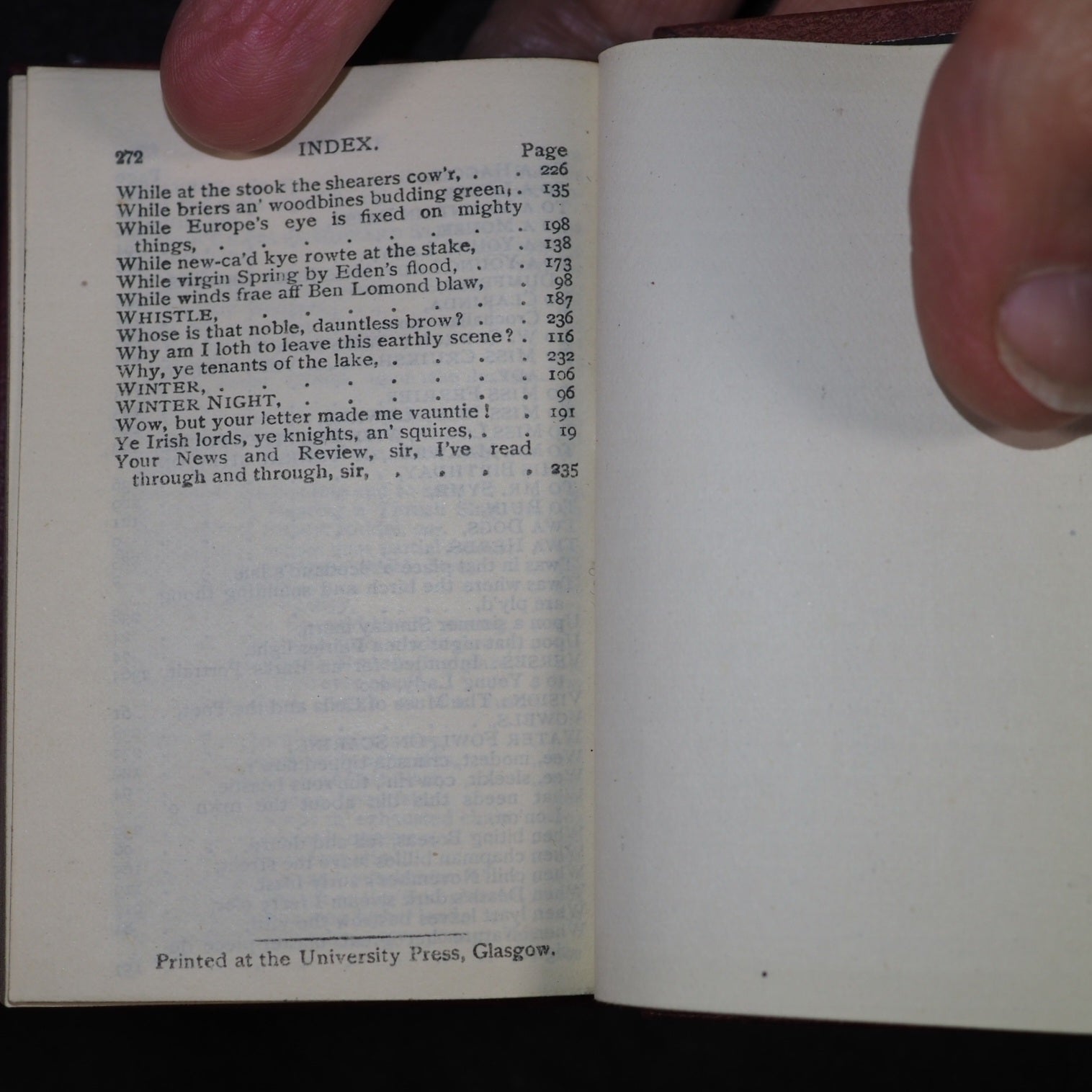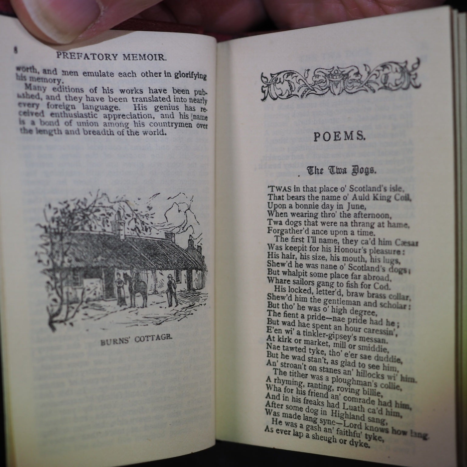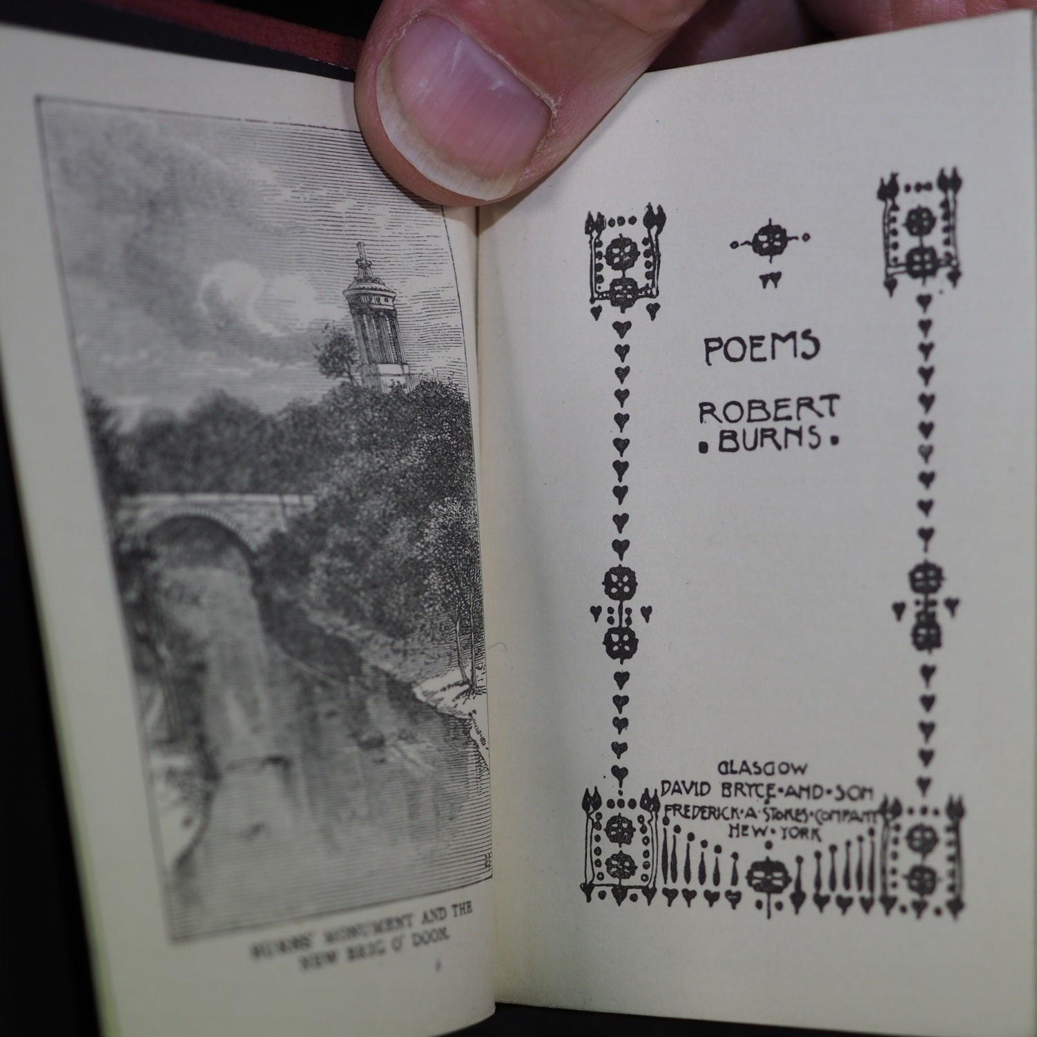 Burns, Robert. Poems. A choice selection from his works, serious and comic. Bryce & Son. Glasgow. 1889. Circa 1889. 272 printed pages. Frontispiece. Binding design & title page by Jessie M King. Dainty Little Library series, 24. Original black endpapers. 60 x 90 mm. Original publisher's burgundy calf. Gilt lettering within art nouveau style decorative borders. The Dainty Little Library saw Bryce re-packaging around thirteen or so classics from the Golden Thoughts and Tartan Series, with art-nouveau re-designed title pages and bindings by Jessie Marion King (1875-1949), a Scottish female children’s book illustrator of high esteem. Volumes 1-5 were Lord Tennyson’s works. 6 and 7 were by Walter Scott. 8 and 9 were Robert Burns title. 10 to 12 were by Wordsworth, Thomas Moore, and Macaulay respectively. All in attractive limp leather bindings of harlequin colours. Garbett, 49. Welsh, 1536. WorldCat locates no copies of the Dainty Little Library edition, worldwide. 47 firsts2024