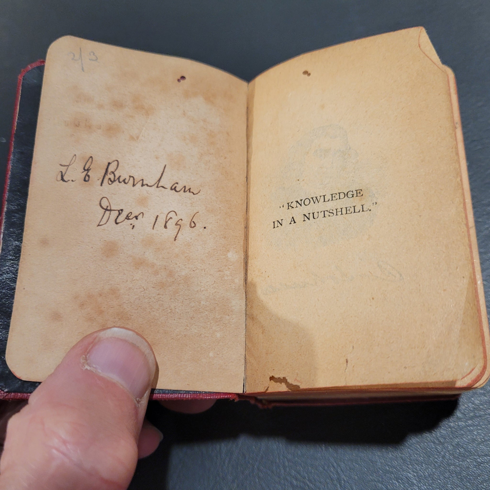 Bound in red buckram with black printed and embossed design of a hanging may, world globe and books to cover; with titles below. Titles in black on spine. Includes... English Dictionary: Atlas of the World; Gazeteer of the World and Book of general Information. Each 'book' has a different coloured section described on page edges. Somewhat rubbed and a little dirty but otherwise tight and good.