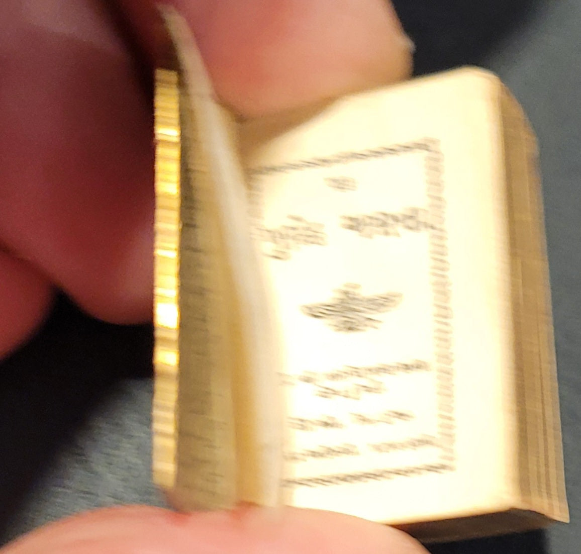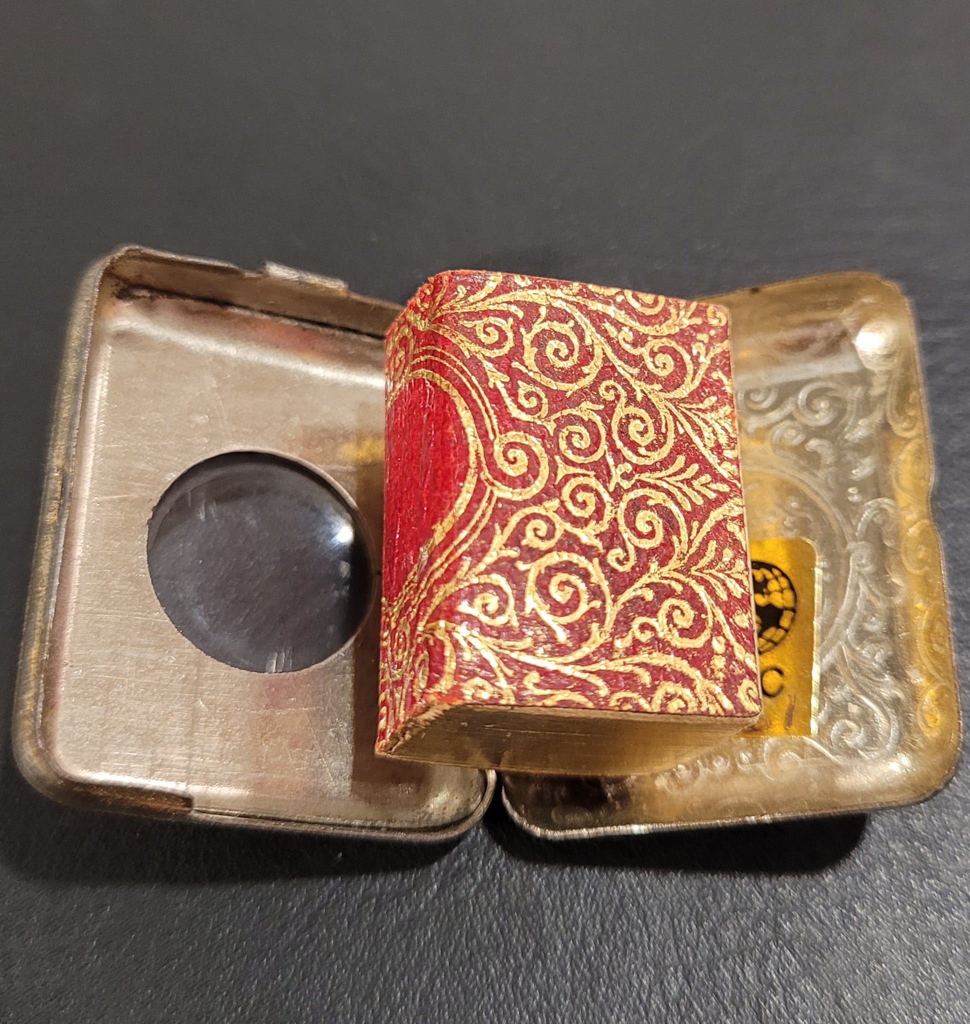 Thicker than the G-P-R & Koran and fractionally taller... Housed in a white metal hinged locket with inset magnifier and engraved floral decoration overall. Case is in reasonable