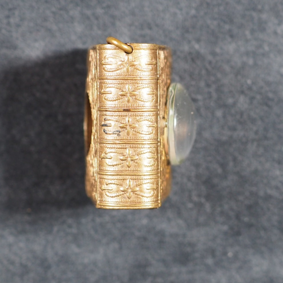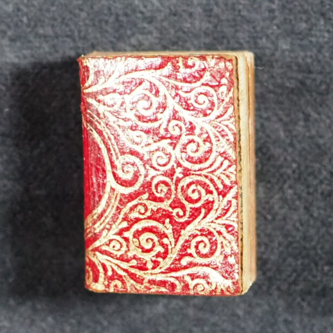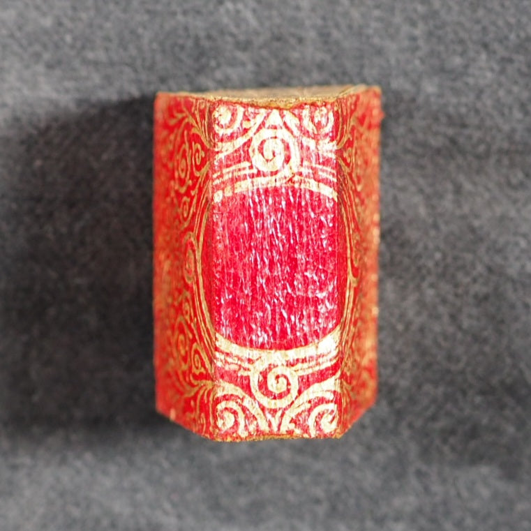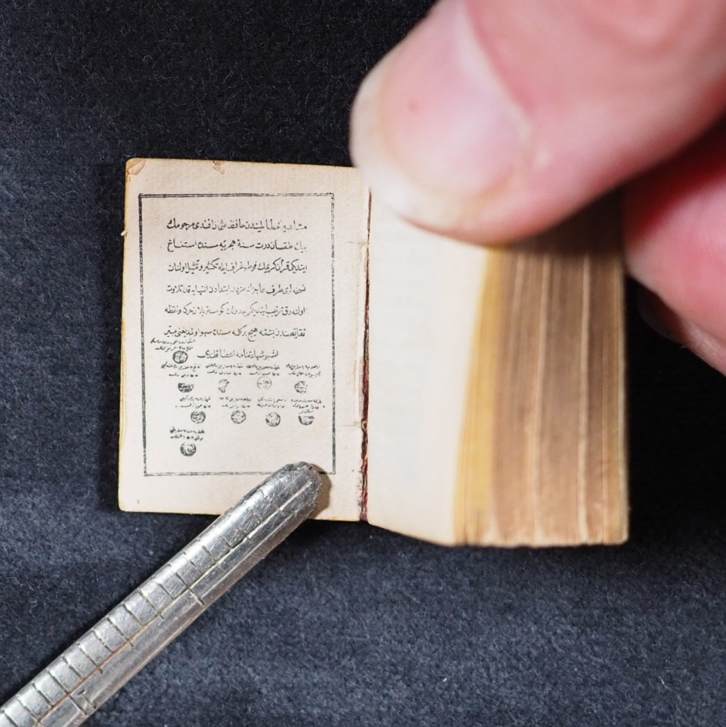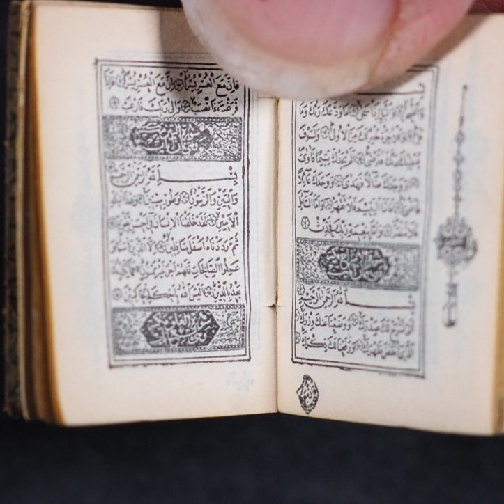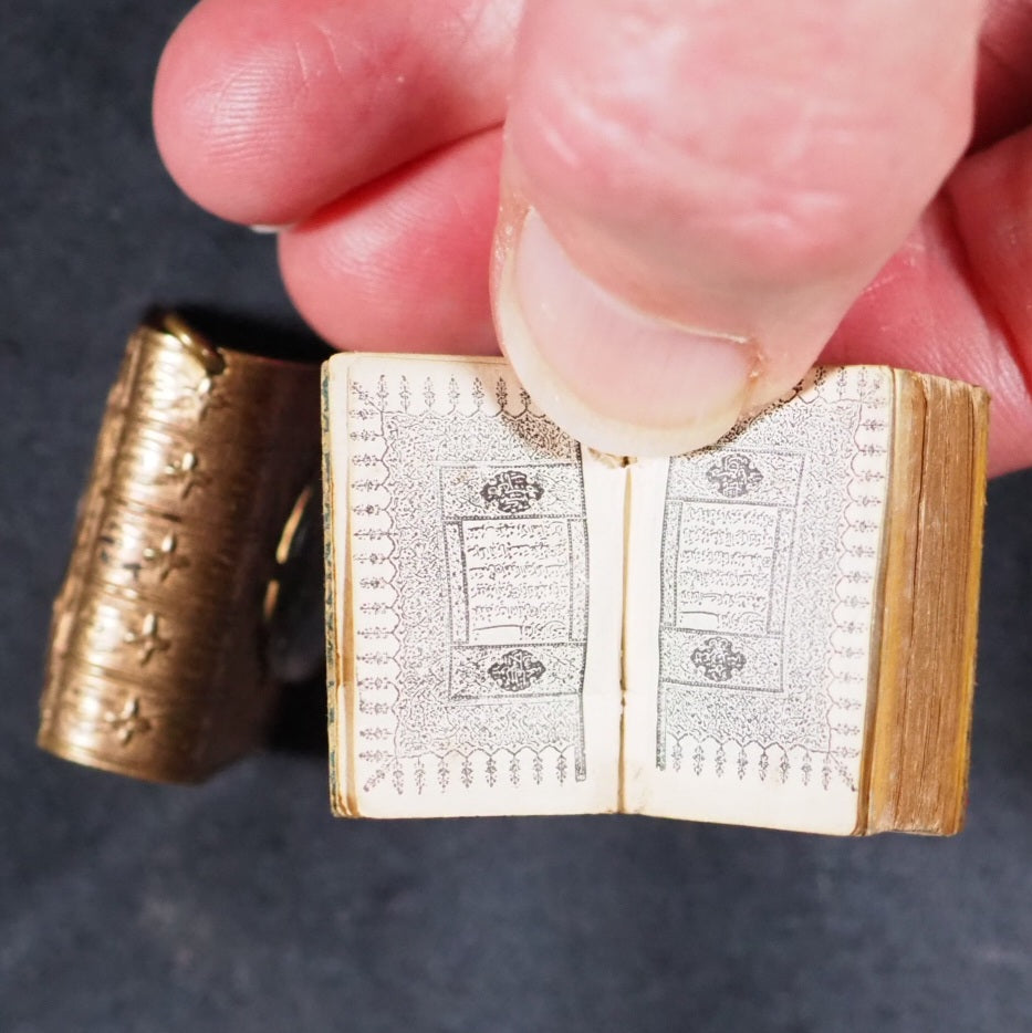 Koran or Qu'ran. David Bryce & Son. Glasgow. 1896. Circa 800 printed pages. Fine India paper, supplied by Henry Frowde. Lithographed text and marginal decoration, printed in Arabic within ruled borders (minuscule marginal tear in gutter of title page) . Original marbled endpapers. 1906 date suggested by D.V. Welsh. But Myrvold and Parmenter state that the Korans were first published in 1896, with reprints in 1899 and 1907. 19 x 26 mm. Original red and elaborately stamped gilt morocco, with lotus motifs and scrolling curlicue decoration. Original pressed brass locket shaped and embossed to resemble a miniature book (straight-grained with ruled corner-pieces and a spine with raised bands and star motif decorations) with a loop at the top, magnifier on the front and Registration number at the bottom (528948). Bryce's miniature Qu'rans are photolithographic reductions of 19th-century Ottoman editions of famous calligrapher Hafiz Osman's Qur'ans: they were based on the 1871 edition, complete with the signatures and seal impressions of the ten Islamic scholars at back and an 1884 edition from Istanbul that provided the Imperial press colophon reproduced here in full. The Sultan and scholar-backed certificate was a legal assertion of the accuracy of the text. Usually offered by the publisher in oblong tin, brass or silver lockets with hinged door and inset magnifier. Occasionally issued as one of a twelve-volume set in a metal shelved glass case with the heading "Midget Library," accompanied by separate miniature magnifying glass; case then fits into an angled wooden stand. Many copies with lockets were supplied to Indian and other Muslim soldiers fighting for the British in the Second Boer War and later World War I, where they were worn as pendants and objects of fascination that carried talismanic properties, as well as serving as functional Qur'ans for reading with the help of the magnifying glass . The Indian Soldiers' Fund (in 1914, the British Indian Army was as much as one third of the entire British fighting force, and over half - more than 150,000 - were Muslims) were instrumental in obtaining and distributing miniature Qu'rans at hospitals (but not packed in boxes with signs for the Red Cross) and the front lines. At least 3,000 copies of this Koran were also bought and distributed by Jewish benefactor, Alfred Ezra, who wrote to Bryce "On receiving one. the man will stand up, put the book over his head and touch each eye with it, and then kiss the book with reverence. They nearly all wear them round their necks, and say that this protects them from all harm". This book shaped brass container is highly unusual and very scarce. An "almost legendary title published by Bryce … The bindings vary from richly gilt-stamped red or black morocco with gilt edges to plain stiff wrappers and yellow edges . . .[and] increasingly difficult to find copies" (Bondy, Miniature Books [1981] 111–2). In The Seven Pillars of Wisdom (Book 4, Chapter 53) T. E. Lawrence wrote: "[Auda] told me later, in strict confidence, that thirteen years before he had bought an amulet Koran for one hundred and twenty pounds and had not since been wounded. . . . The book was a Glasgow reproduction, costing eighteen pence; but Auda’s deadliness did not let people laugh at his superstition." A similar edition is in the Queen Mary's Dolls' House in Windsor Castle. Bondy, 111-2. Garbett, 29. Pistner, B233:6. Spielmann, 28. Welsh, 4174. OCLC, 1053056481. WorldCat locates 2 copies worldwide (Washington and North Texas University Libraries). 7 firsts2024