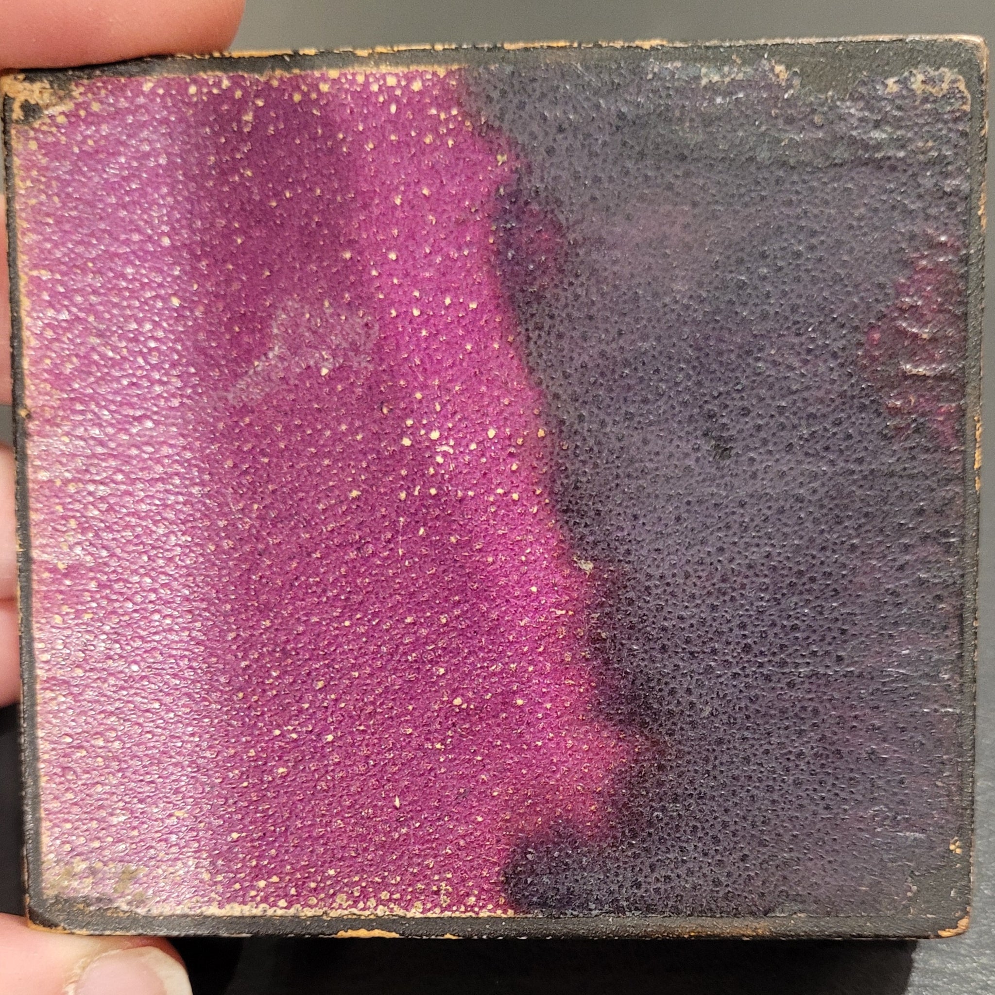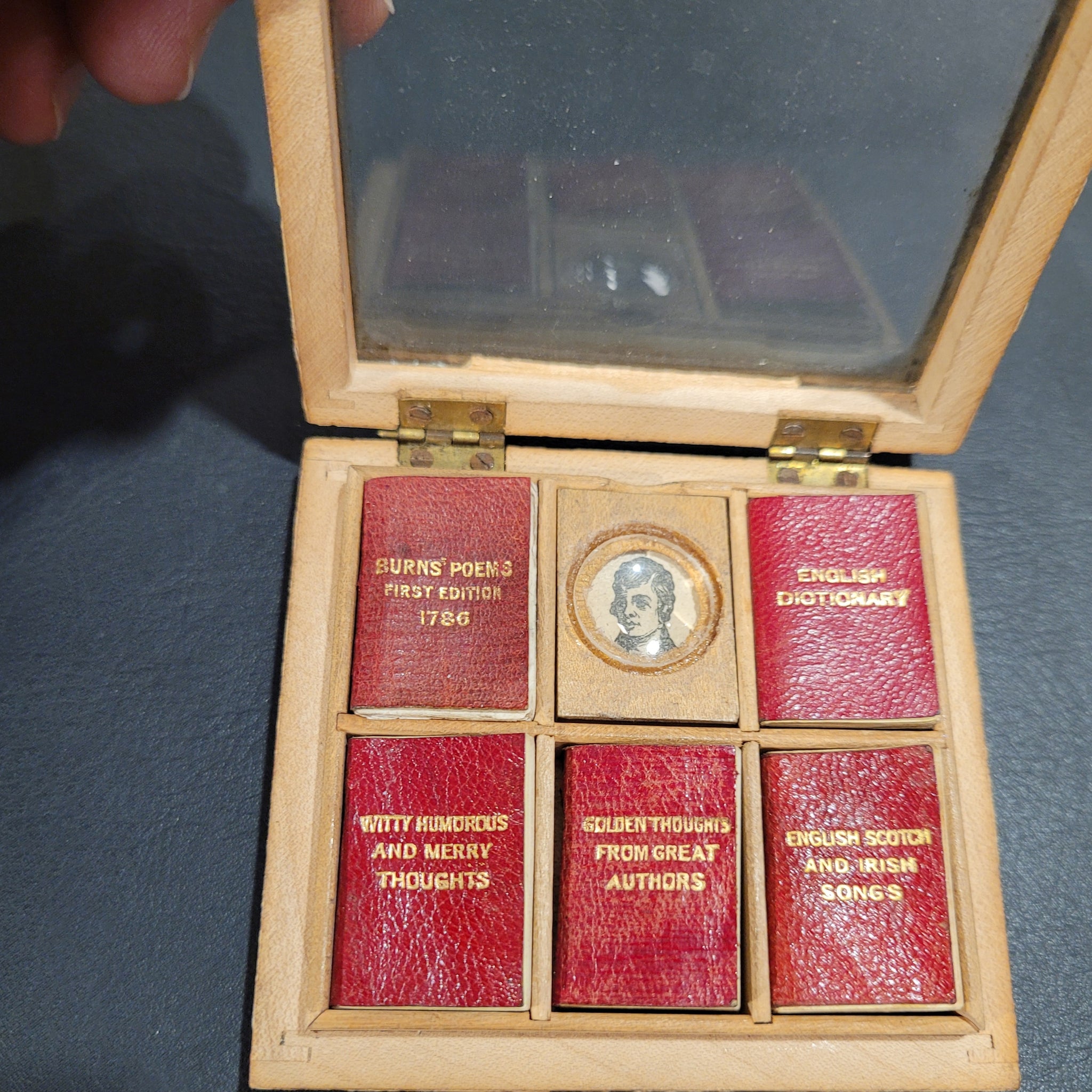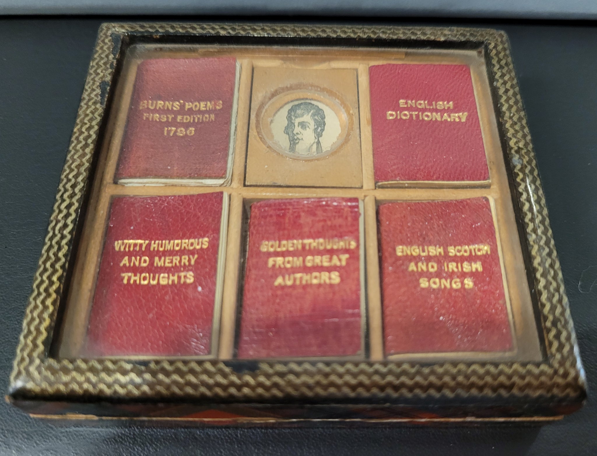 Burns' Poems First Edition 1786; Bryce's English Dictionary: Witty Humorous and Merry Thoughts; Golden Thoughts from Great Authors; English Scotch and Irish Songs. Housed in fitted wooden box divided into six compartments. The hinged top consists of a framed piece of glass. Gilt saw-tooth decoration on black paper framing the top, the remainder covered in Bonnie Prince Charlie Tartan paper. The sixth space in the box has a portrait of Burns beneath a magnifying glass. Books bound in red roan with titles in gilt to front cover
