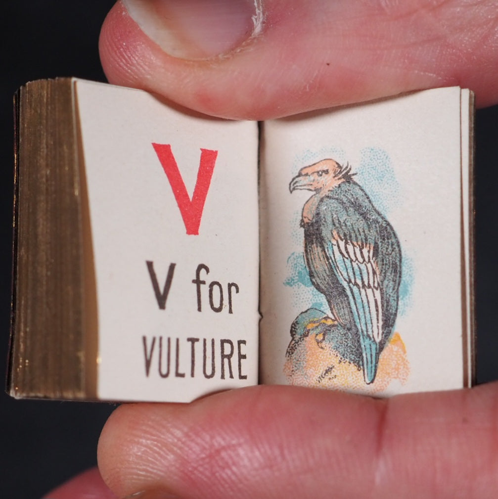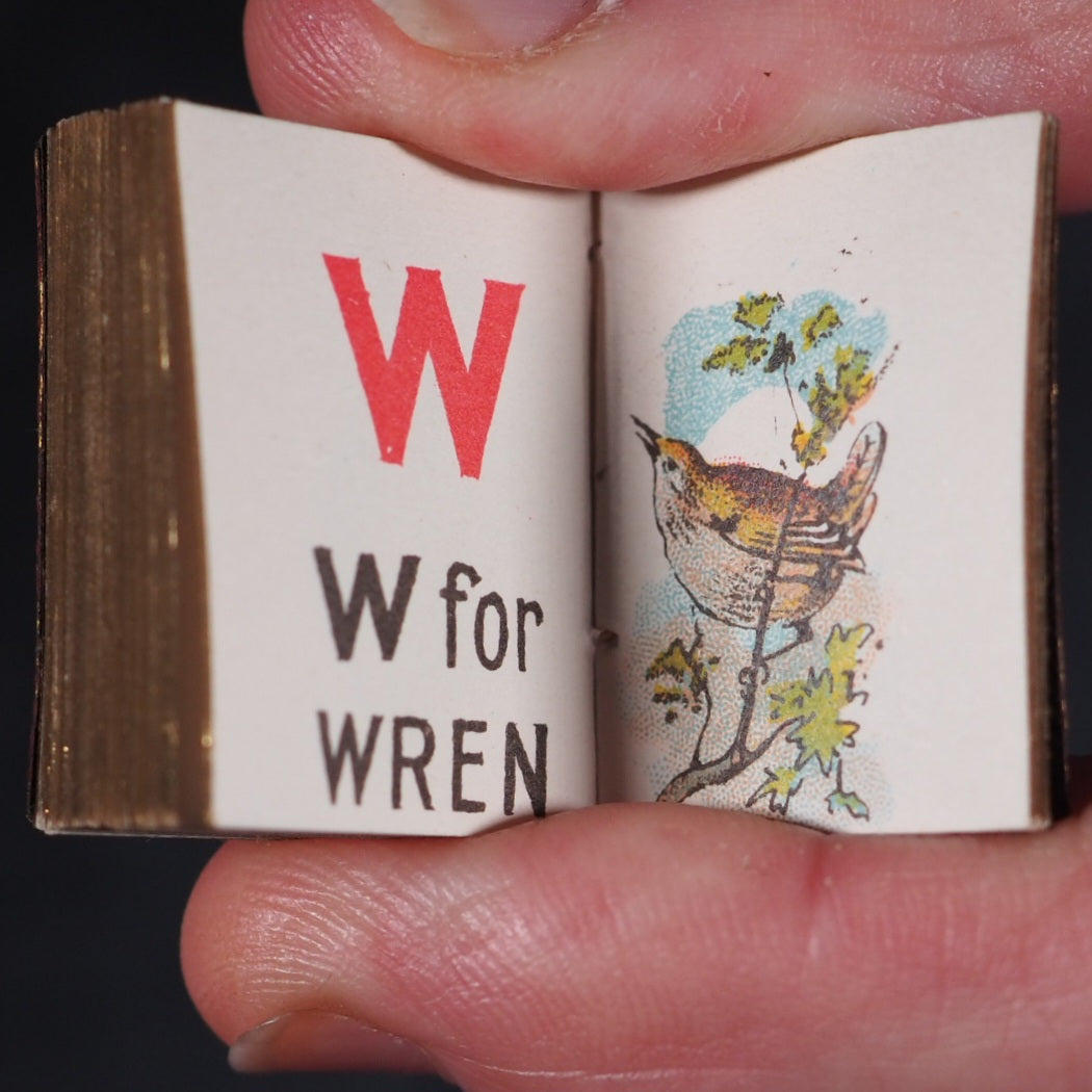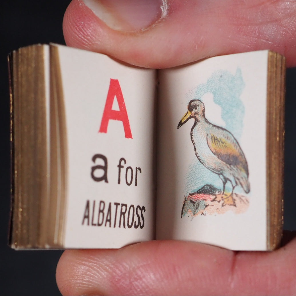 My Tiny Alphabet Book Bryce, David & Son. Glasgow. 1896. Undated (but 1896). 2 volumes in one. 64 and 62 unnumbered chromolithographed pages. Tiny alphabet of animals and Tiny alphabet of birds. Midget Series. The only book published by Bryce in colour and the smallest colour printed book in 1900. Usually bound in pictorial paper covers. Listed at number nine in Ruth Adomeit's '32 BASIC BOOKS FOR THE Serious Collector'. Original brown endpapers. All edges gilt. 22 x 29 mm. Original red morocco; front cover with gilt 'My Tiny Alphabet book' and image of young boy and girl. Bondy, 72. Bromer, 131. Garbett, 46. Pistner, B233:9-10. Spielmann, 489. Welsh, 5200. OCLC, . WorldCat locates copies worldwide. 169 firsts2024