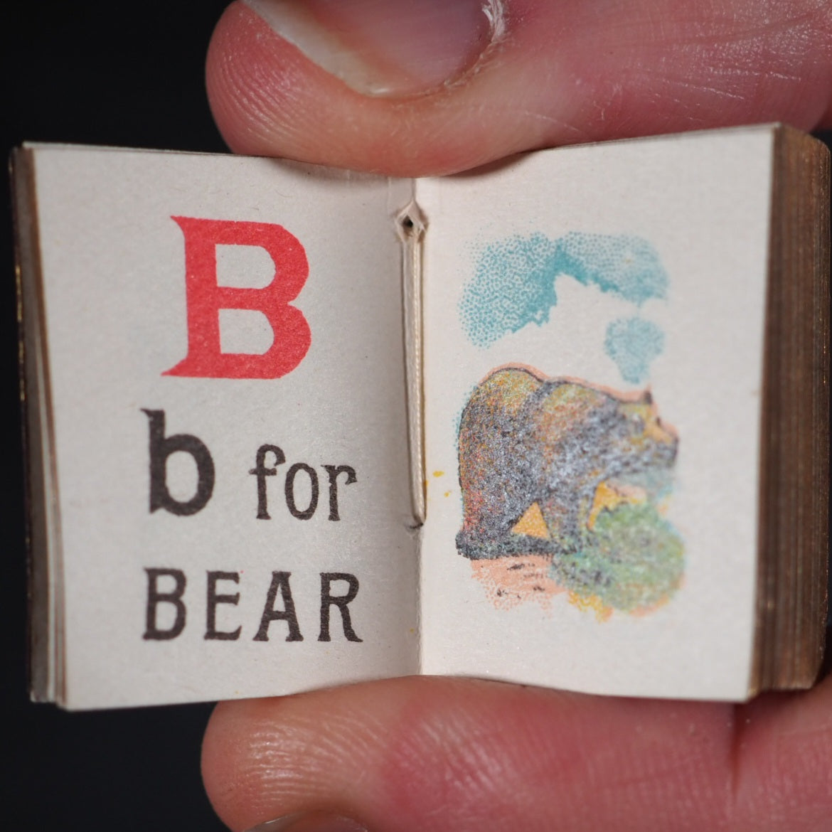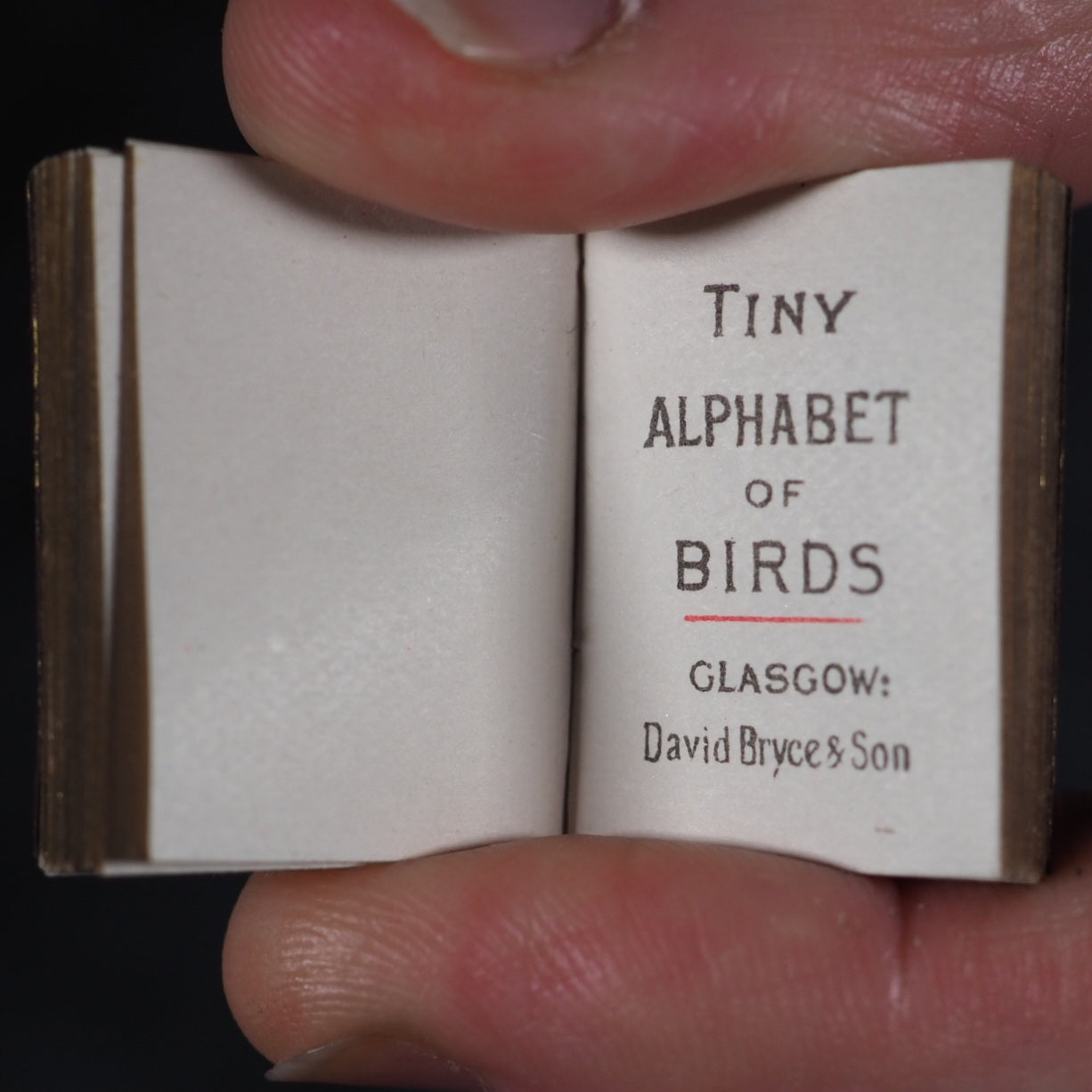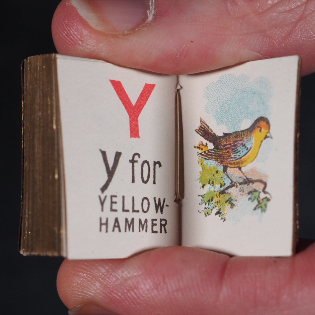 My Tiny Alphabet Book Bryce, David & Son. Glasgow. 1896. Undated (but 1896). 2 volumes in one. 64 and 62 unnumbered chromolithographed pages. Tiny alphabet of animals and Tiny alphabet of birds. Midget Series. The only book published by Bryce in colour and the smallest colour printed book in 1900. Usually bound in pictorial paper covers. Listed at number nine in Ruth Adomeit's '32 BASIC BOOKS FOR THE Serious Collector'. Original brown endpapers. All edges gilt. 22 x 29 mm. Original red morocco; front cover with gilt 'My Tiny Alphabet book' and image of young boy and girl. Bondy, 72. Bromer, 131. Garbett, 46. Pistner, B233:9-10. Spielmann, 489. Welsh, 5200. OCLC, . WorldCat locates copies worldwide. 169 firsts2024