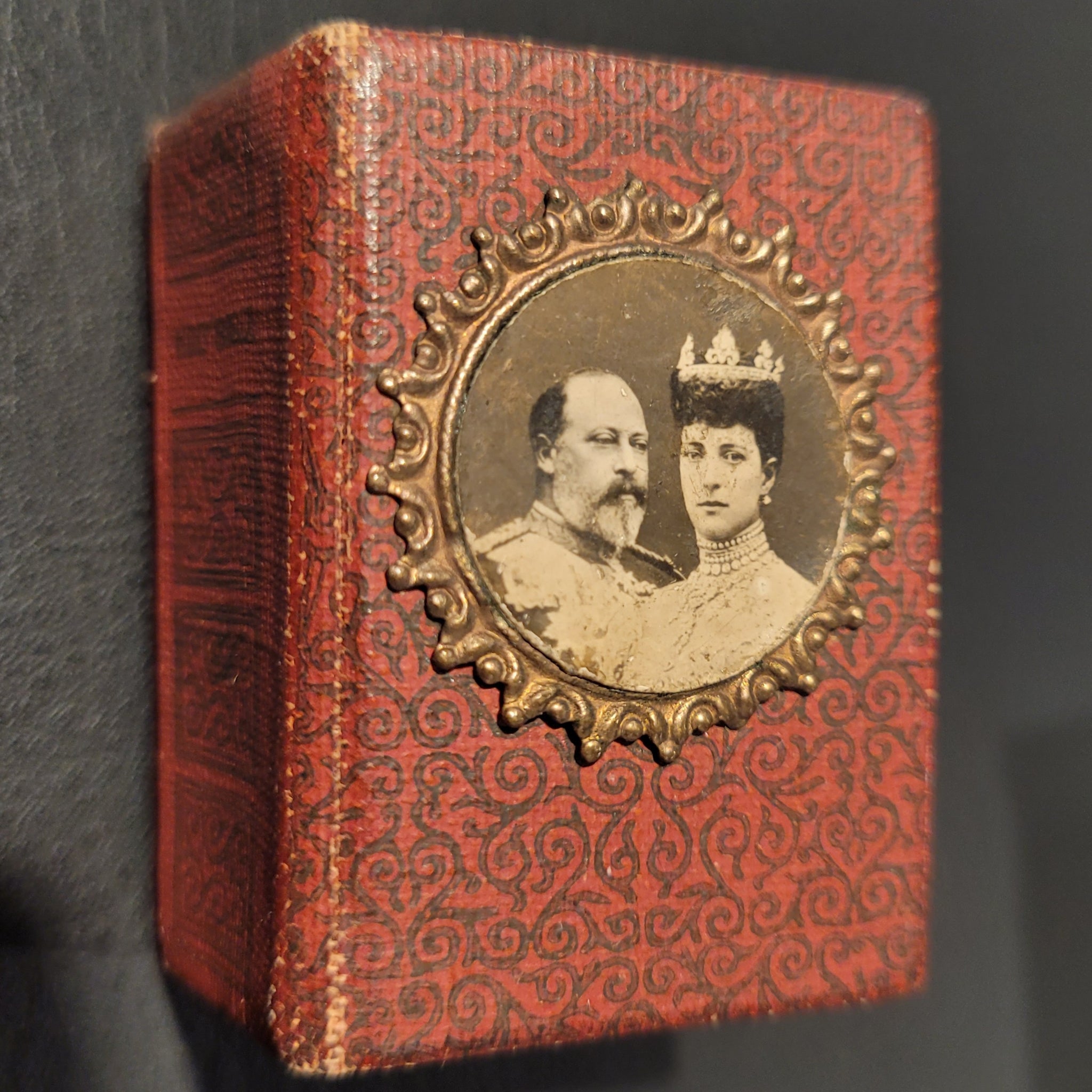 over decoration, title to spine, with a round metal medallion having a photograph of King Edward VII and Queen Alexandra glued to the front. Yellow edges.
