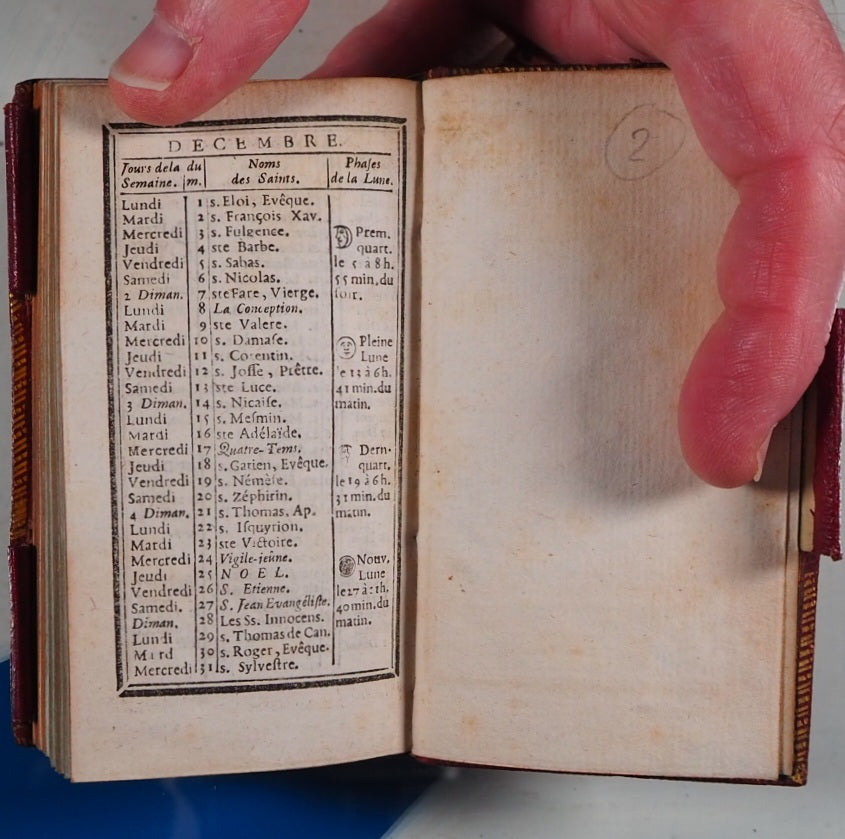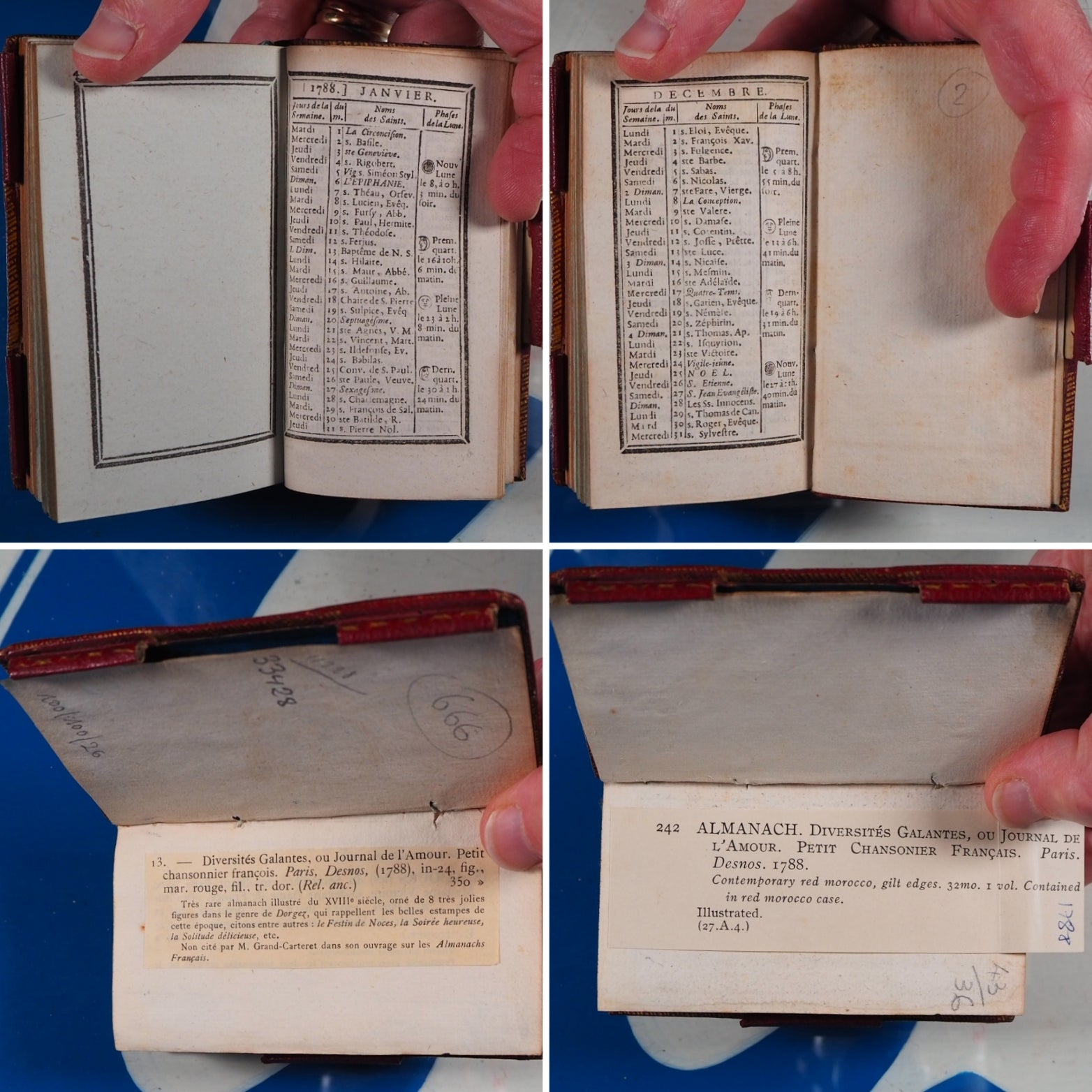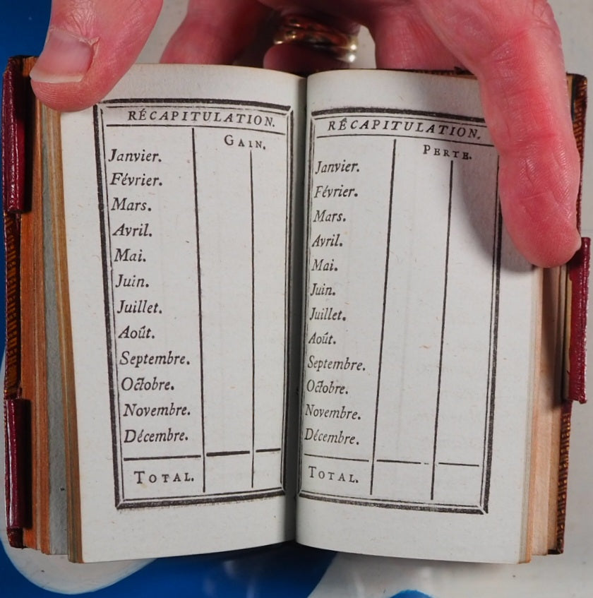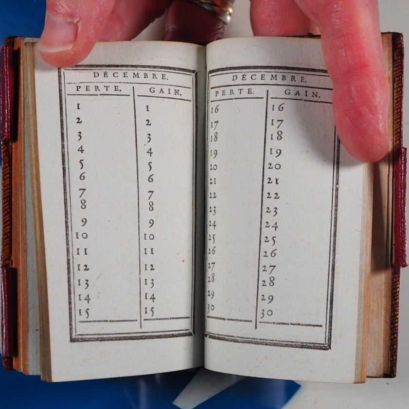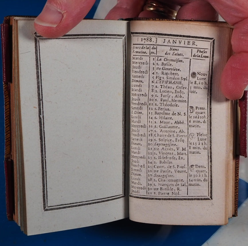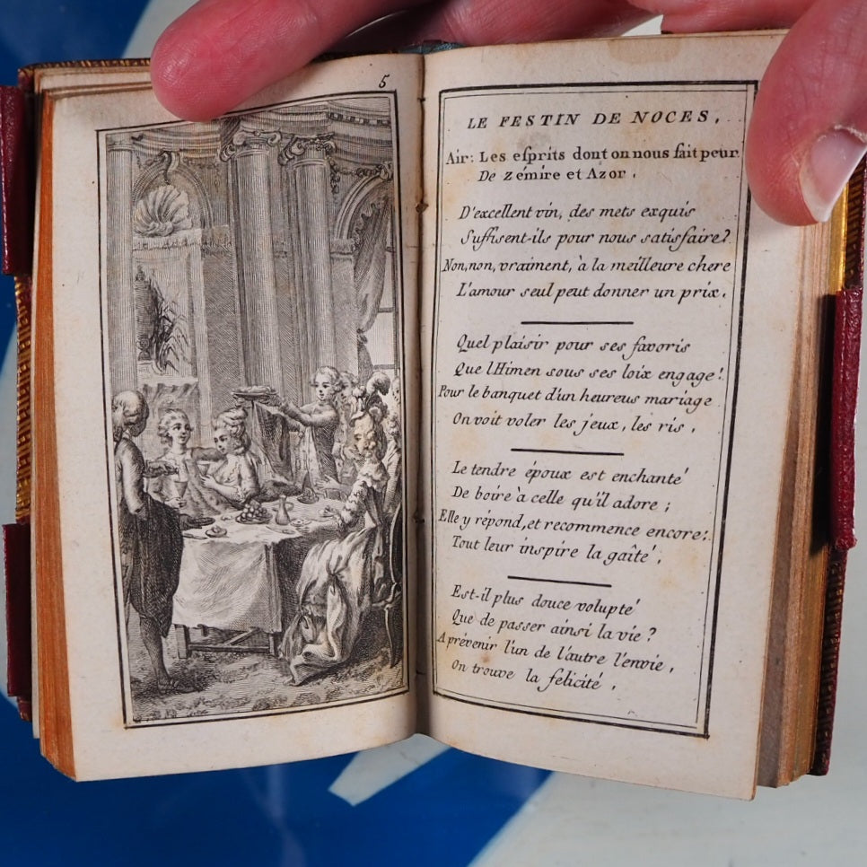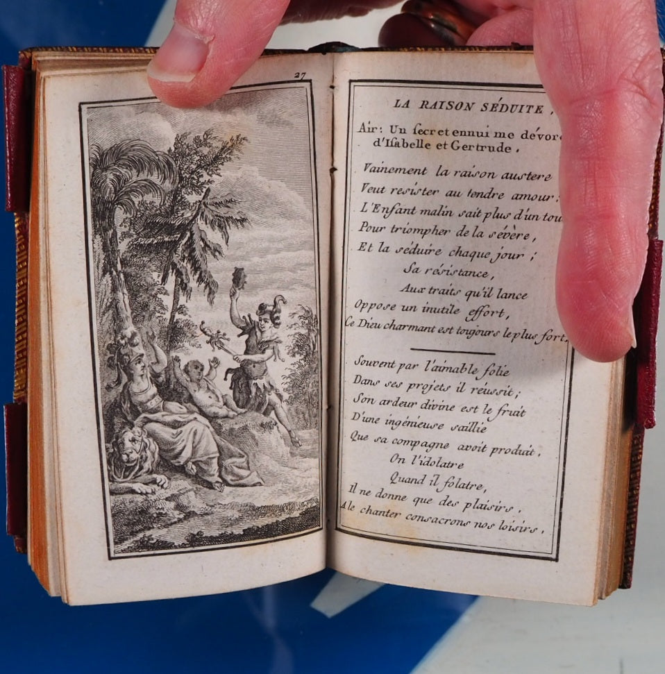 No date but 1788. 94 printed pages with printed twin black borders, 8 finely engraved plates with accompanying engraved titles and texts facing (lacking leaf A1 additional engraved titlepage,reading: Recueil de chansons des meilleurs auteurs, etc). Contemporary ink stamp to title-page. Bound with Le Secretaire des Dames et des Messieurs, same publisher, 48 printed pages on blue tinted paper, with similar borders and with some blank spaces for notes. Also bound with 12 page calendar at end. Bookseller's antique printed descriptions pasted to blank preliminary & frontispiece verso. Contemporary cornflower blue silk place-marker. Leather gilt stamped heraldic label of Sir David Lionel Salomons + similar label of Edward Hailstone on contemporary blue front endpapers. Imprint size 2.1 x 3.8 inches; binding 2.6 x 4.5 inches. Contemporary ruby red morocco binding (very slightly rubbed & corners very slightly bumped). Spine in compartments with scrolling gilt floral hand-tooling within double fillet and pointille borders; green morocco tilting piece with gilt lettering. Covers with triple fillet gilt borders and inner gilt dentelles. Three original gilt decorated loops for keeping the almanac closed but original pin no longer present. All edges gilt. Sir David Lionel Salomons (1851 1925) was a scientist with a fabulous watch collection who owned the second ever car in Britain and organised the first ever car show in the world. Edward Hailstone (1818-90) was a Yorkshire solicitor, churchwarden and book collector. Louis Charles Desnos (1728-1805) was a renowned mapmaker globe maker and publisher of Paris. Not in Grand-Carteret. Cohen-De Ricci, 42. WorldCat only locates one other copy of this edition (at the British Library). This is a rare and highly collectable French almanac. Seller Inventory # 5267