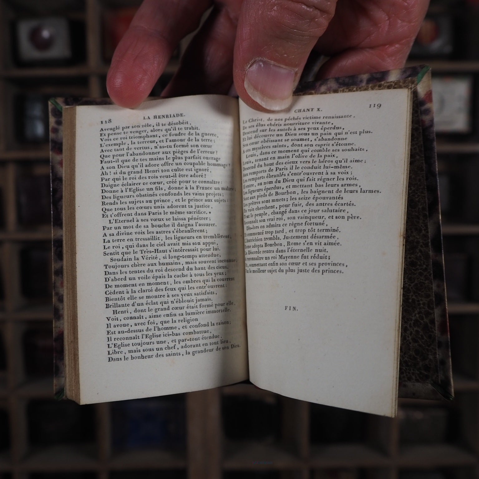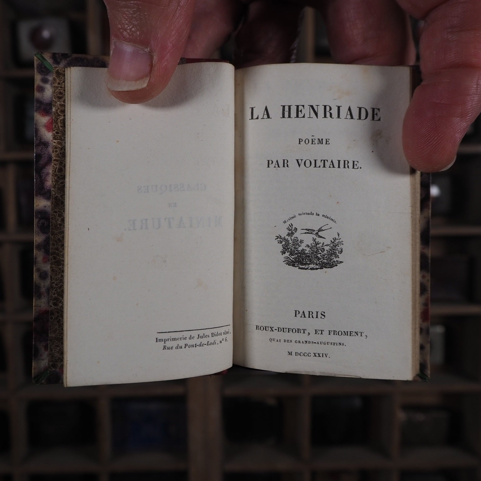 119 printed pages (sporadic light foxing). Printed by Jules Didot aine, rue du Pont-de-Lodi, nº 6, Paris, in a clear diamond sized type. All edges speckled. Charming German marbled endpapers. Black silk place-keeper. 60 x 95mm. Contemporary red quarter calf over French shell marbled paper covered boards. Spine with gilt lettering and tooled floral leaves and tendrils at head and foot, between single gilt ruled borders. The epic poem in French is about Henri le Grand (Henry iv of France). One of Classiques en Miniature series of publications, individually published between 1824-7. Bondy, 90. Nauroy, 41.  Welsh, 6994. Not in Spielmann. WorldCat locates just two copies of this edition (in the National Libraries of France and of Spain). Seller Inventory # 5321