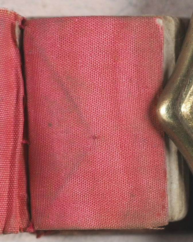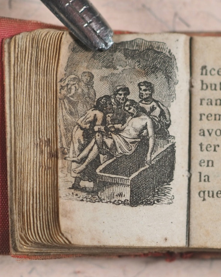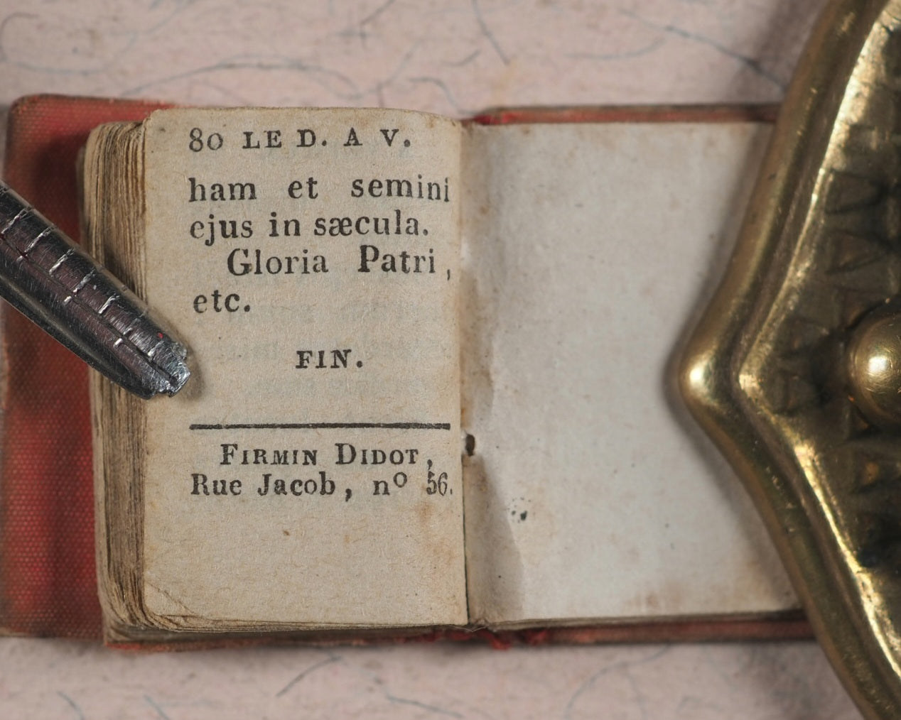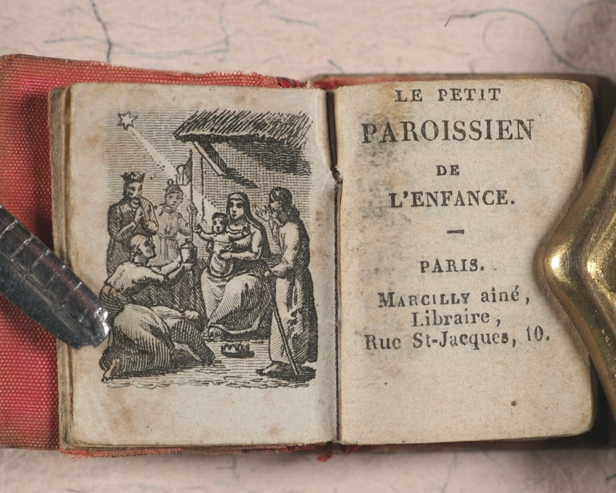 80 printed pages in French. 5 engraved full-page plates. Printed by Firmin Didot, Rue jacob, 56, Paris. This title is less common than the "Petit Paroïssien de la Jeunesse". Mildly age-toned pages. All edges gilt. Original salmon endpapers. 22 x 26 mm. Original mother-of-pearl boards; simple etched cross on front board. Silk red spine. Text block slightly loose in its binding. Spine a little worn. Bondy, 77-8. Grand-Carteret, 1493. Gumuchian, 4128. Spielmann, 403. Welsh, 5590.