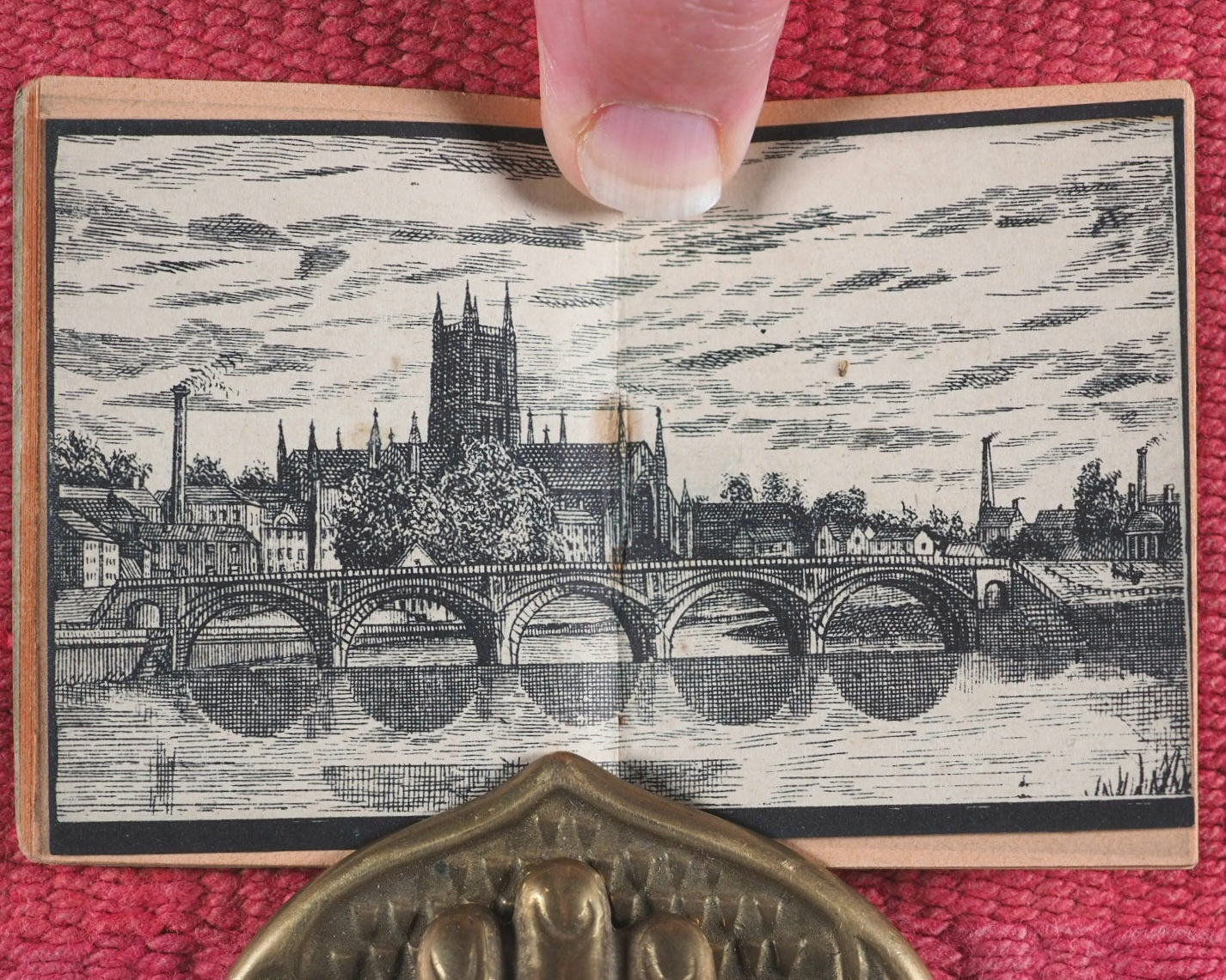 [32] unnumbered printed pages, half are publisher's adverts. Black print on orange paper. Double page engraving of Worcester cathedral in the centre. 50 x 63mm. Original staple bound card covers. Slight mark on upper cover. A very scarce and beautifully printed promotional miniature booklet of local history interest. In very good condition and an unexpected survivor. Not in WorldCat nor Bondy, Spielmann, nor Welsh. WorldCat locates no copies worldwide.