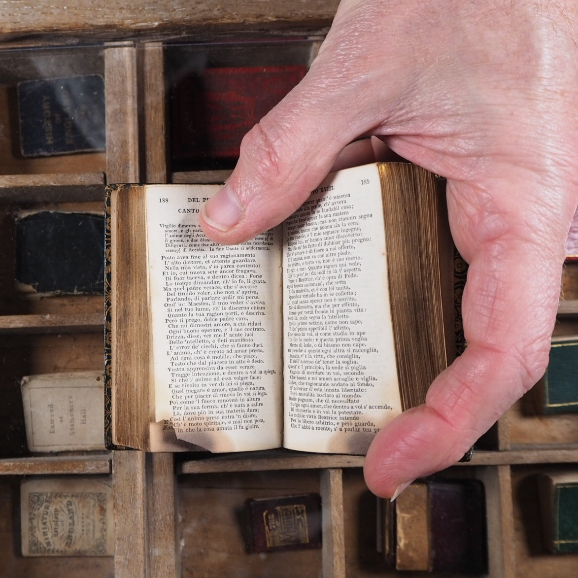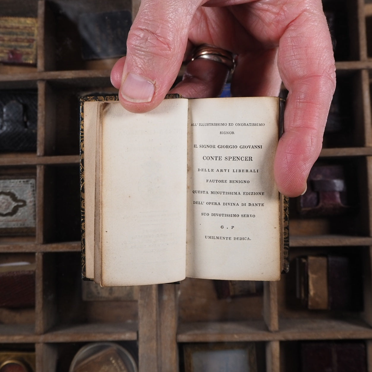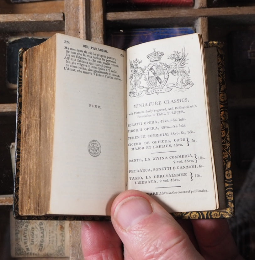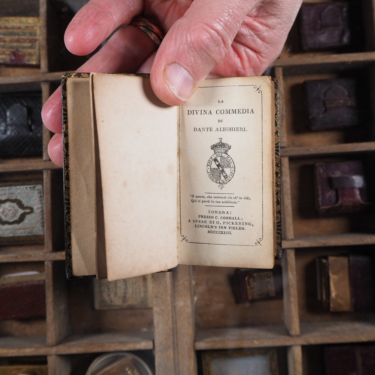 Three parts in two volumes, bound in one. In original Italian. 374 printed pages + [4] of adverts, engraved title in first volume, and frontispiece portrait of Dante by R.Grave, after R.Morghen (old stain to lower corner of some leaves, one with chip, and also some dustiness). Dedication leaf to Earl Spencer. Corrall's fine and clear Diamond 4 1/2-point typeface. All edges gilt. Inner gilt dentelles. Original primrose endpapers (very slightly faded). 1.8 x 3.3" Contemporary dark green gilt morocco, spine hand-tooled with gilt lattice grid and horizontal double fillet borders; upper & lower covers with scrolling central motif with cornerpieces within double fillet gilt borders (slightly rubbed, crack at base of spine and to upper joint). An early Pickering title, because in 1826 the publishing house moved to Chancery Lane. In the original cloth, without the additional cost of a fine binding such as this one, the price of this book in 1823 was ten shillings. Bondy, 88. Spielmann, 113. Houghton, 194. Welsh, 2160. Seller Inventory # 5289