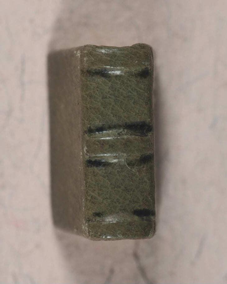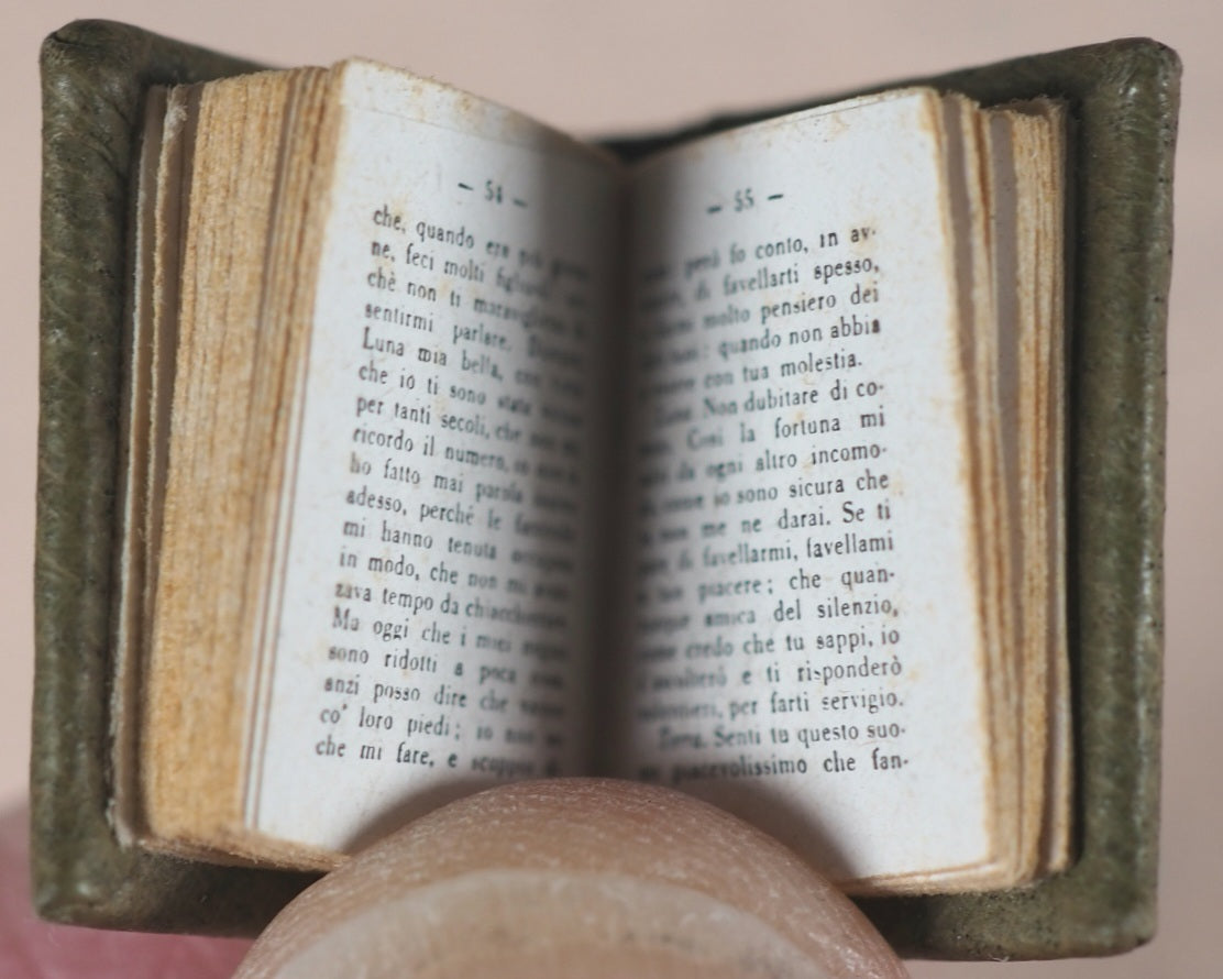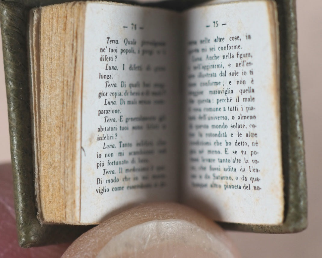 78 printed pages includinghalf-title & title + 3 pages of index and colophon in Italian. Printed by Tipografia Artigianelli. Circa 2.5-point photographic reduction. Produced in the middle of the Second World War, amazingly. Unnumbered limited edition of 250 copies. Contains three dialogues of famous poet, Leopardi (1798-1837): "Dialogue of an elf and a gnome - Dialogue of Federico Ruysch and his mummies - Dialogue of the Earth and the Moon". 14 x 22 mm. Original olive morocco; spine with three raised bands; front cover titled 'Leopardi' in gilt. Bondy, 178. Neelands/Joffe, 191. Spielmann, 292. Welsh, 4358. OCLC, 35227848. WorldCat locates 10 copies worldwide.