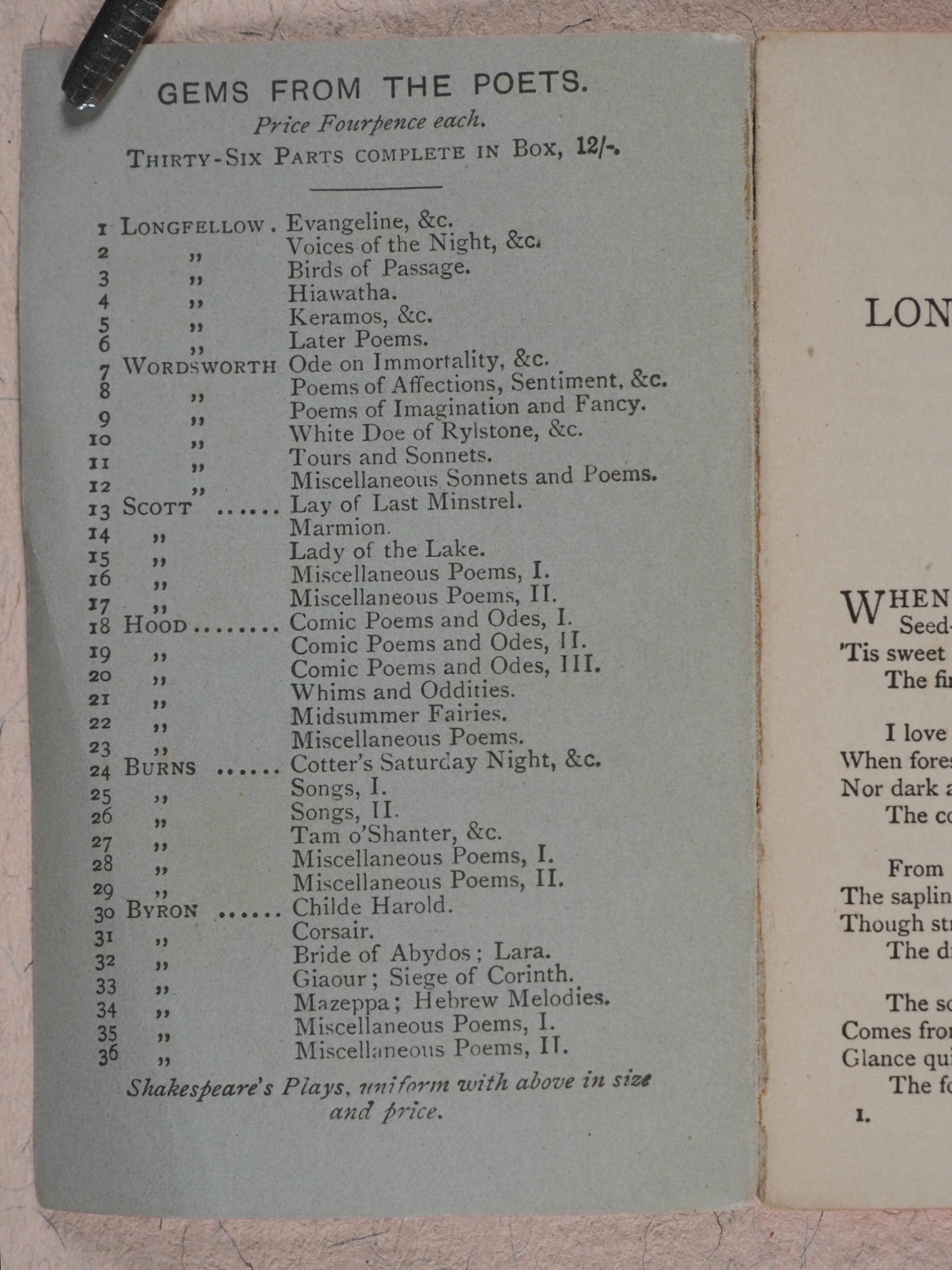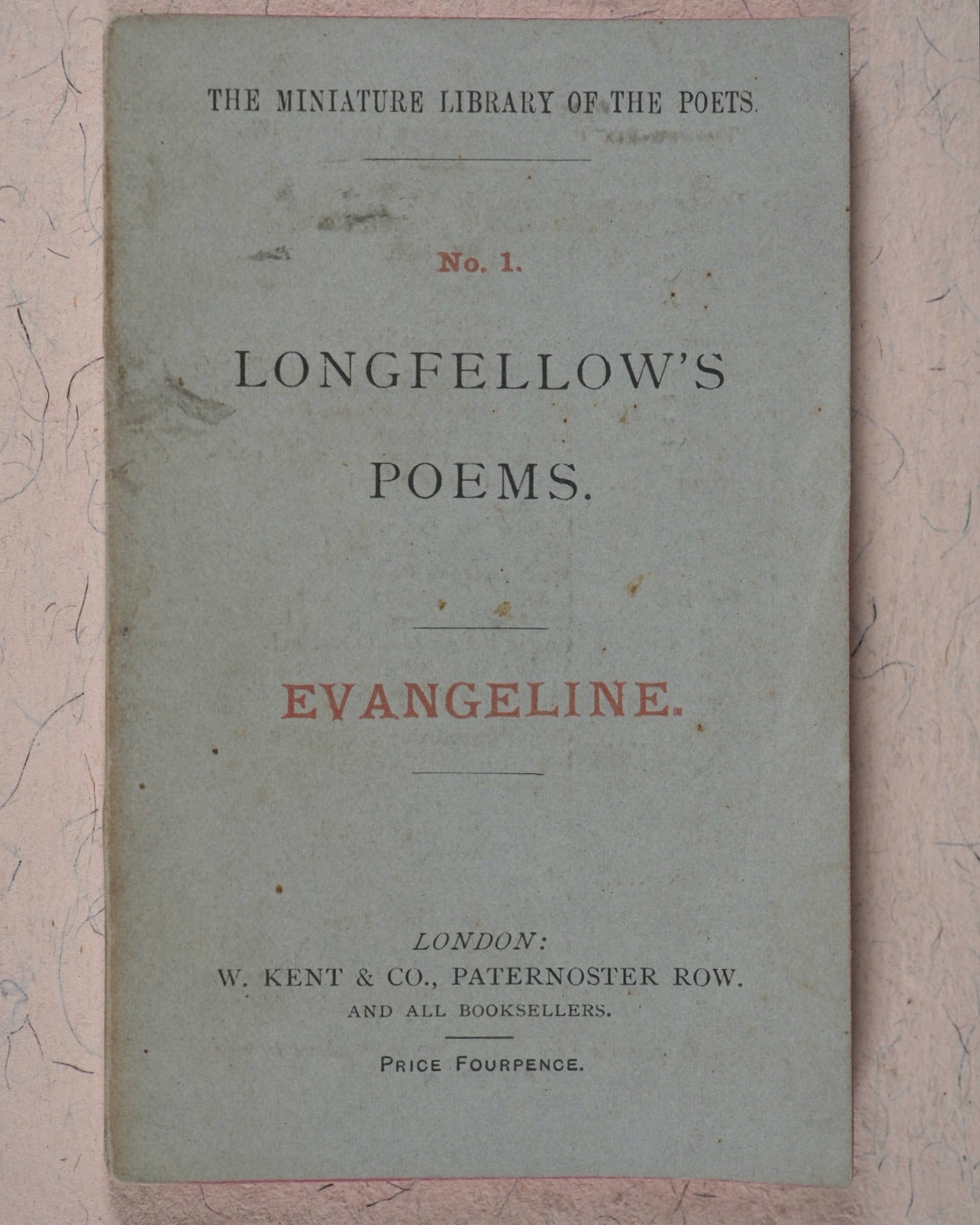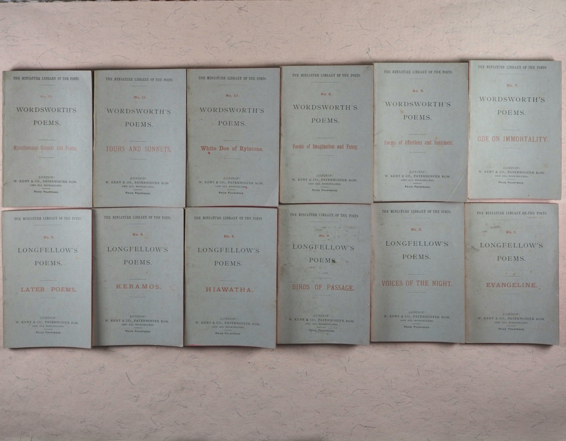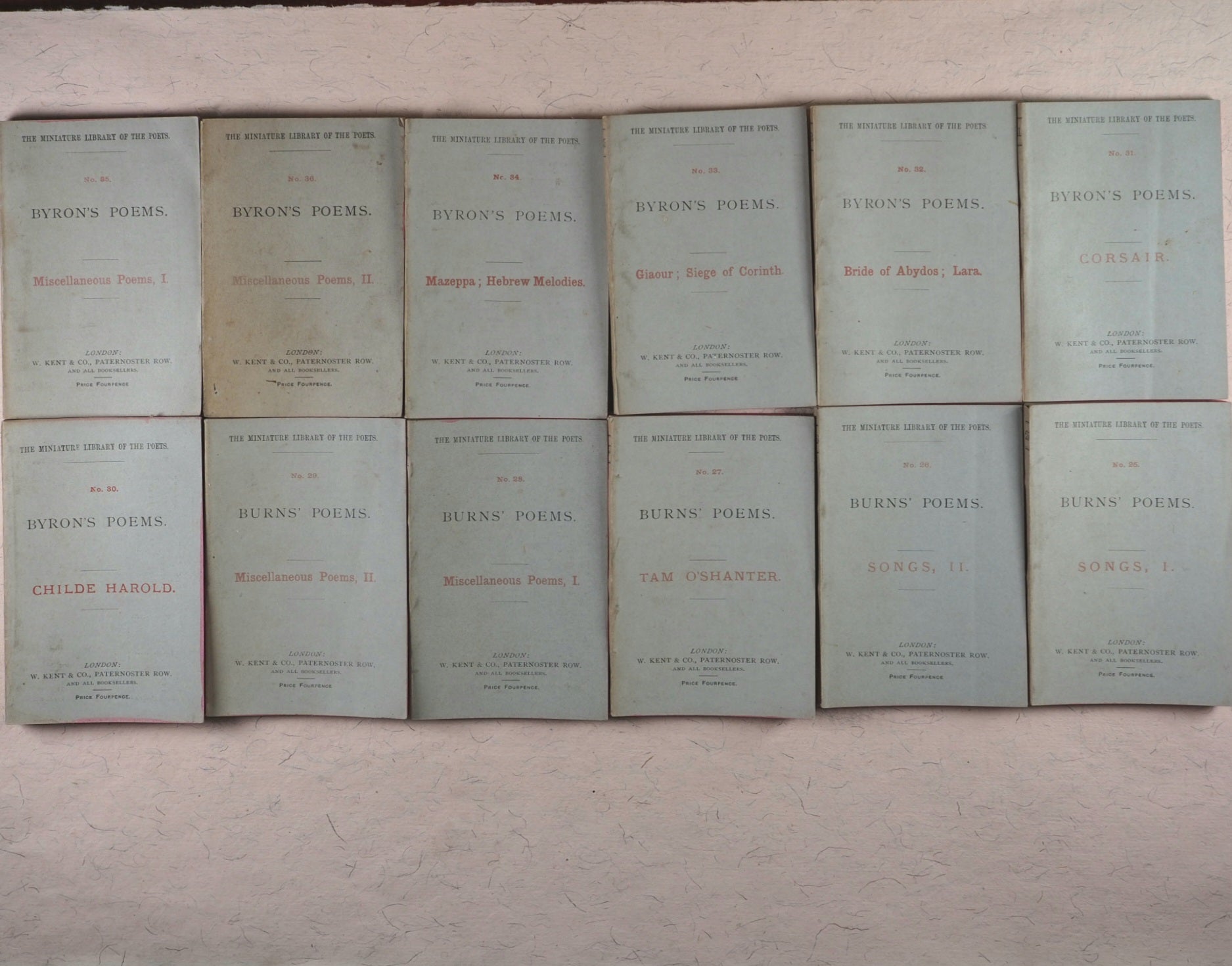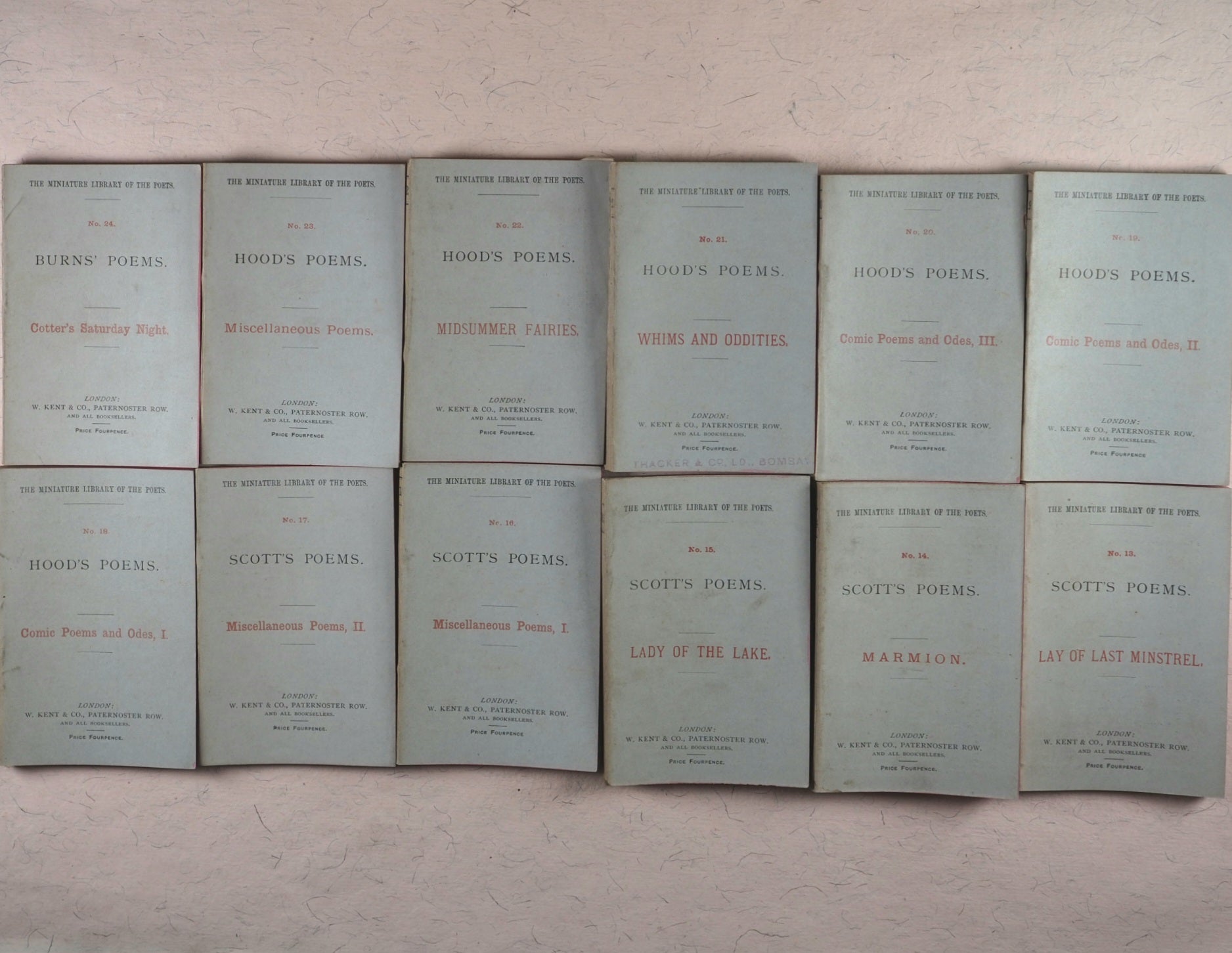 36 volume complete set in original box (no lid extant) with original silk ribbon and part original paper label 'Gems from the Poets'. "W. Brendan and Son, Printers, Plymouth"- colophon, and originally priced at twelve shillings. 69 x 105 mm. Original publisher's printed paper wrappers; red and black printing on front covers; publisher's advert on back covers; numbers 1-36 on spine. Minuscule marks of handling and age on covers and spines. In 1885 Cassell seem to have acquired the rights of publication for a short time and their imprint to have superseded that of William Kent. "The primary object ... of the 'Miniature Library of the Poets' being to supply the public with standard works in as portable a form as possible ..." A complete set in the original box and in original paper bindings is rare. OCLC, 906457667. WorldCat locates 3 copies worldwide (University of North Texas, Midllebury College and Koninklijke Bibliotheek).