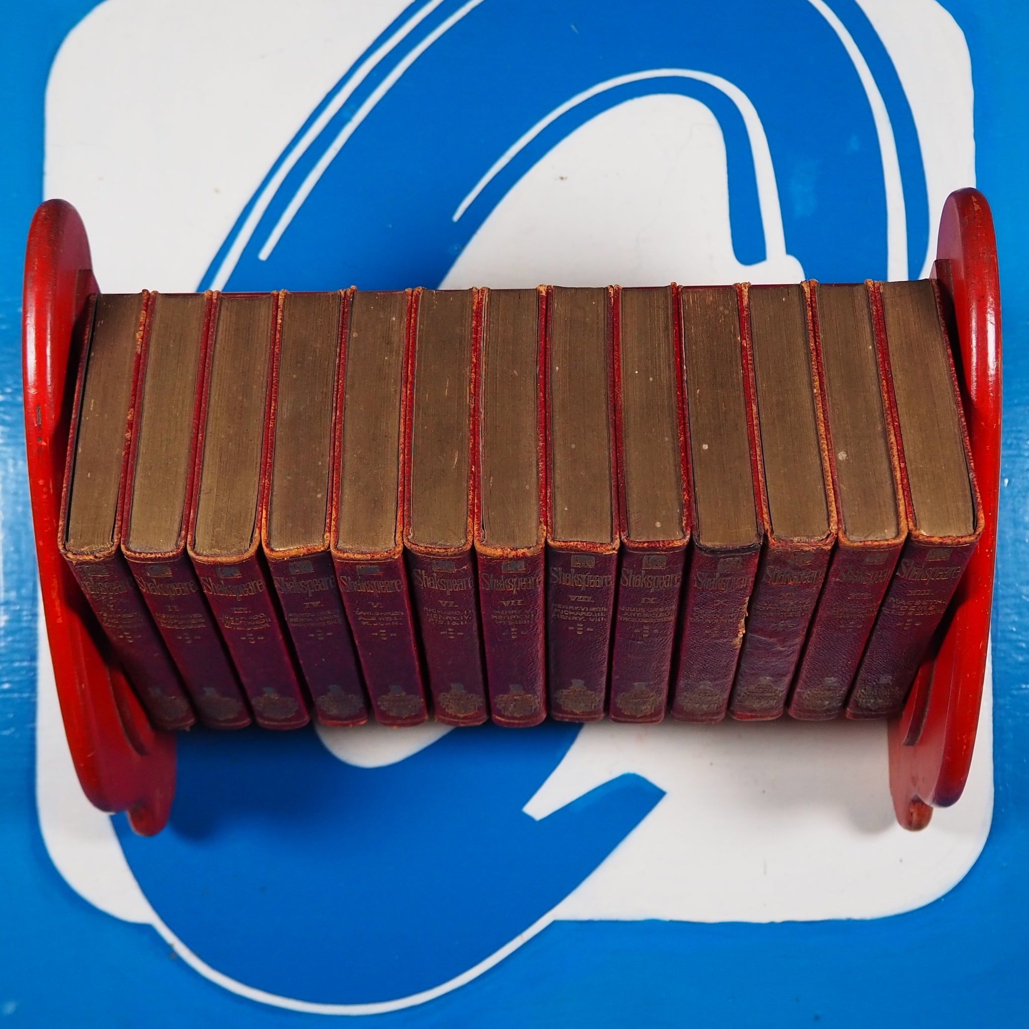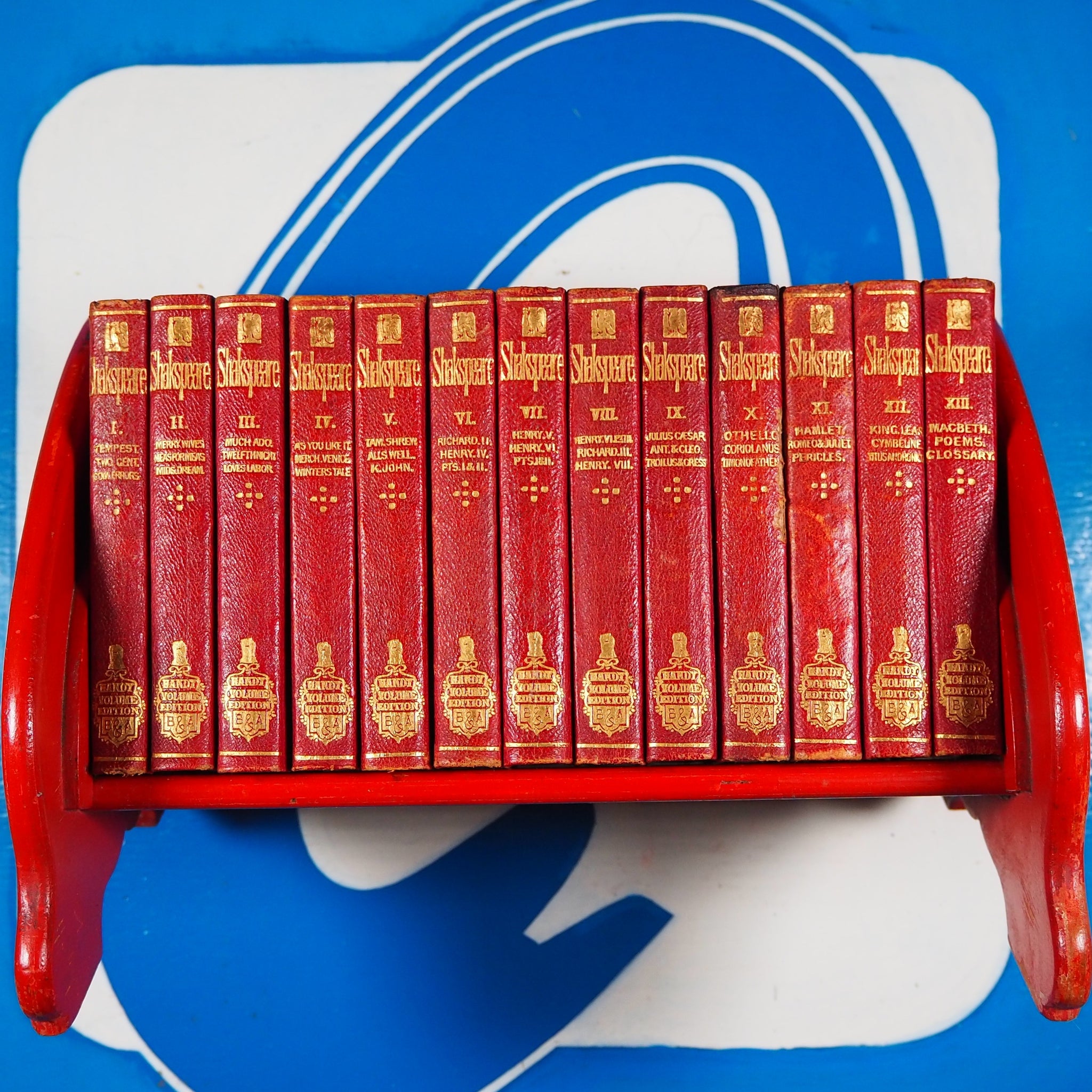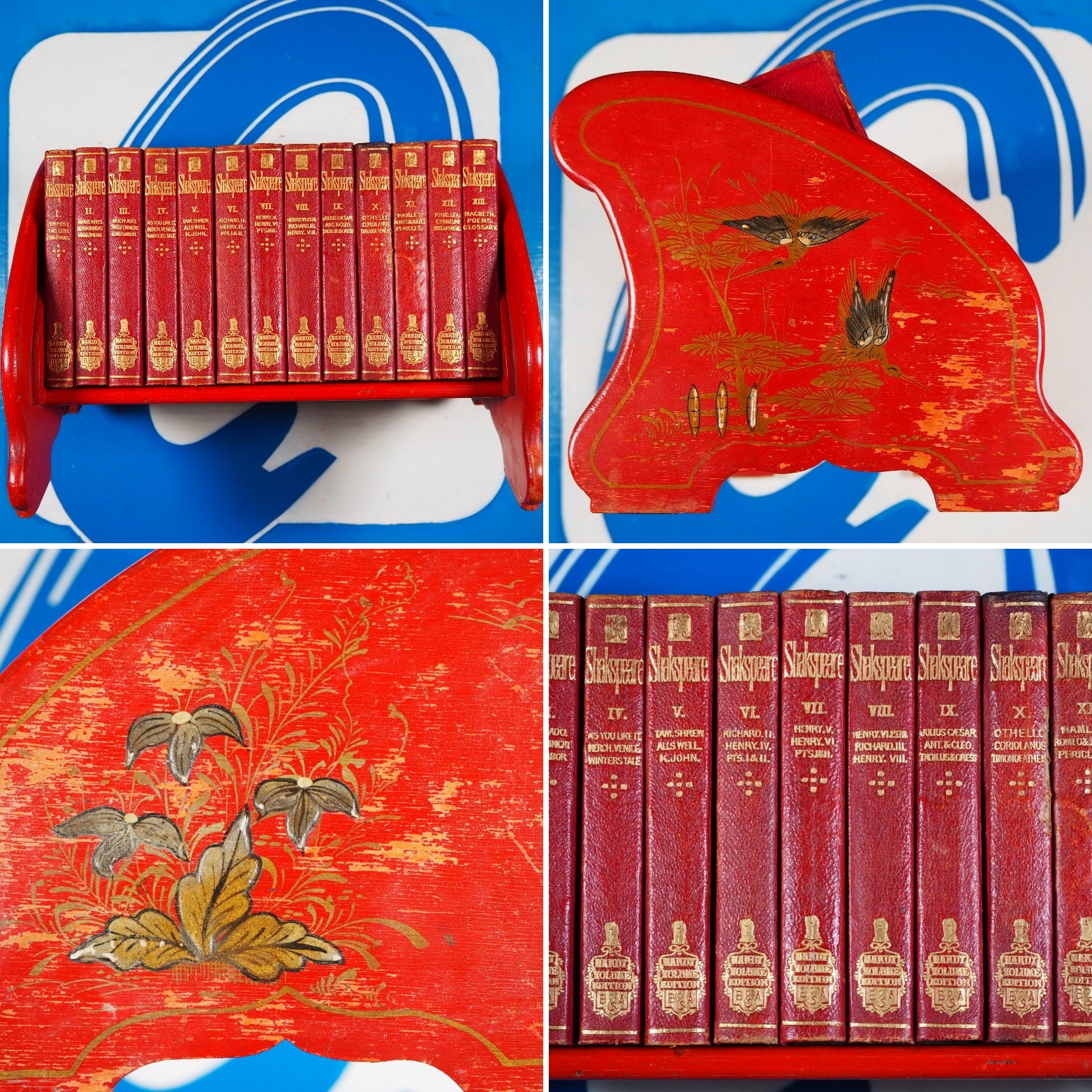 No date. Circa 1873. 12mo. Complete set of 13 volumes. All edges gilt over red. 25 x 18 x 15 cm (Japanned stand measurements). Publisher's full crimson red soft morocco binding, spines lettered & numbered in gilt. Some rubbing to the edges of a few volumes. Short wormhole on hinge of Vol. x Presented in charming , original, Japanned stand. Lacquered in red with gold and black cranes and exotic flowers in relief hand shellacked, painted and varnished on either end (some slight wear and patination to the ends). Japanning is a type of finish that originated as a European imitation of Asian lacquerwork that, by the 1880s, was an industry in decline due to changes in fashion and taste. Still an elegant way to have displayed the complete 13 volumes of the Bard's works anywhere from the library desktop, to the dressing-table. Bradbury, Agnew & Co., from 1872, at 10 Bouverie Street, was founded in 1872 when Frederick Moule Evans (1832-1902) left Bradbury, Evans and Co., the firm he had jointly managed with William Hardwick Bradbury (1832-1892) since 1865 when their fathers, who had founded the firm in 1830 as Bradbury and Evans, retired. The Agnew art dealer family, into which both W. H. Bradbury and his sister, Edith, had married, had brought new capital into Bradbury, Evans and Co. in 1865. This injection of capital saw William Agnew (1825-1910) and his brothers Thomas (b 1827) and John Henry became partners when Bradbury, Agnew and Co. was founded. The new firm continued to publish Household Words, Once a Week, and Punch but limited their overall publication of titles to just Shakespeare, the Bible, some archaeology and fox-hunting titles and a few others such as Sylviculture , George Du Maurier, & Theophile Gautier. More frequently found in a close fitting cloth or leather slipcase, this original displayed set is a rare survivor. Bookseller Inventory # 5029