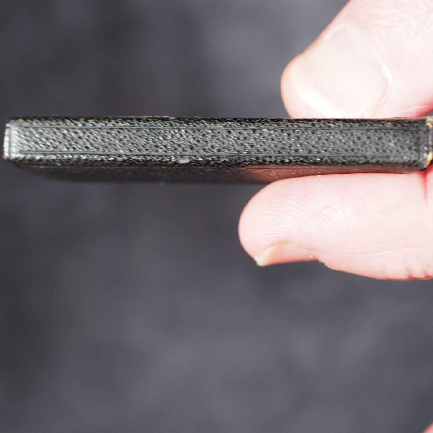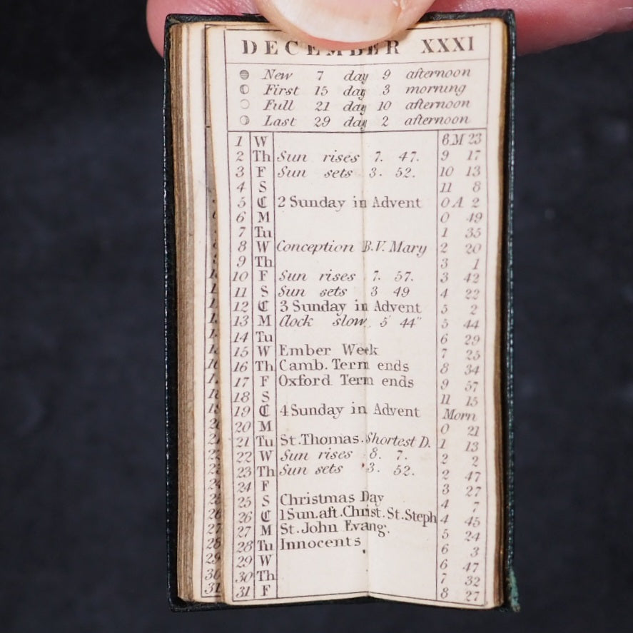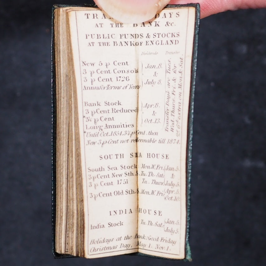 London Almanac for the year of Christ 1847. Company of Stationers. London. [1846]. 17 double pages with stamps, transfer days at the bank, calendar, table of Kings and Queens, the Cabinet and the Court. Inner joint split but holding firm. Original pale yellow endpapers. Corners and edges lightly rubbed. This is a good example of the even smaller edition, half the size of the normal edition. Bondy calls this the "curious finger format resulting from the leaf being folded vertically... with no frontispiece illustrations". 18 x 60mm. Original emerald morocco with plain matching slipcase (slightly darker with patina). Bondy, 39-41 & 164. Spielmann, 340 and Welsh, 4656 for larger sized version. WorldCat locates no copies worldwide of this edition in this format. #5592