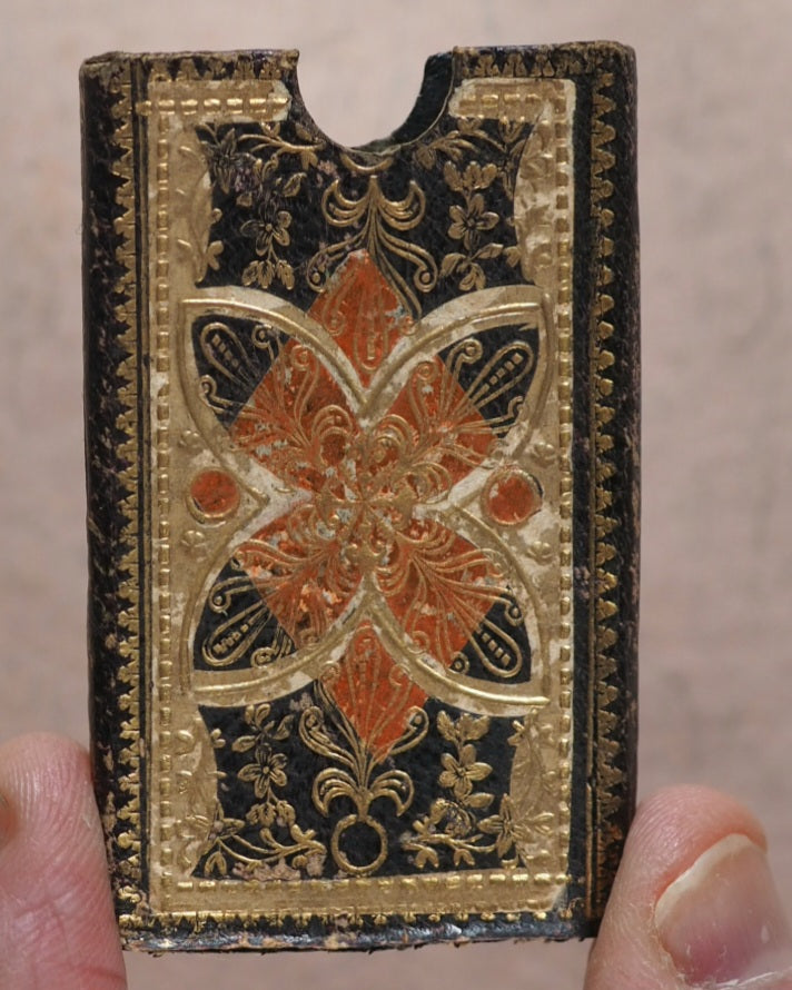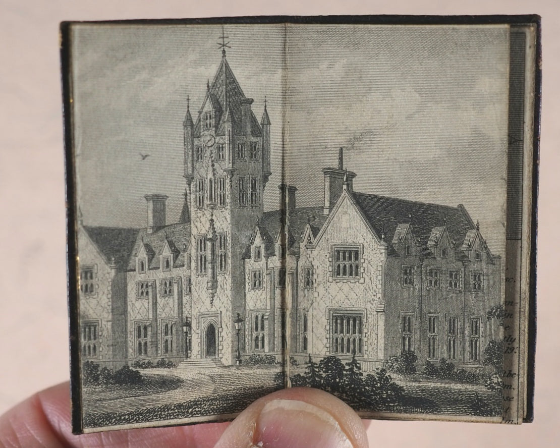 Engraving of the Gospel-Oak School, Kentish Town, on four pages. Thirteen leaves. All edges gilt. Original pale yellow endpapers. Original matching decorative calf slipcase. 30 x 60 mm. Original black, orange and gilt venetian style calf in matching slipcase. Very slight abrasion at corners. A similar example of this book can be found in Her Majesty Queen Mary's Dolls' House at Windsor Castle. Not in Spielmann. Not in Welsh, but see 4676 for finger-sized edition. WorldCat locates no copies worldwide (only the square and finger editions located).
