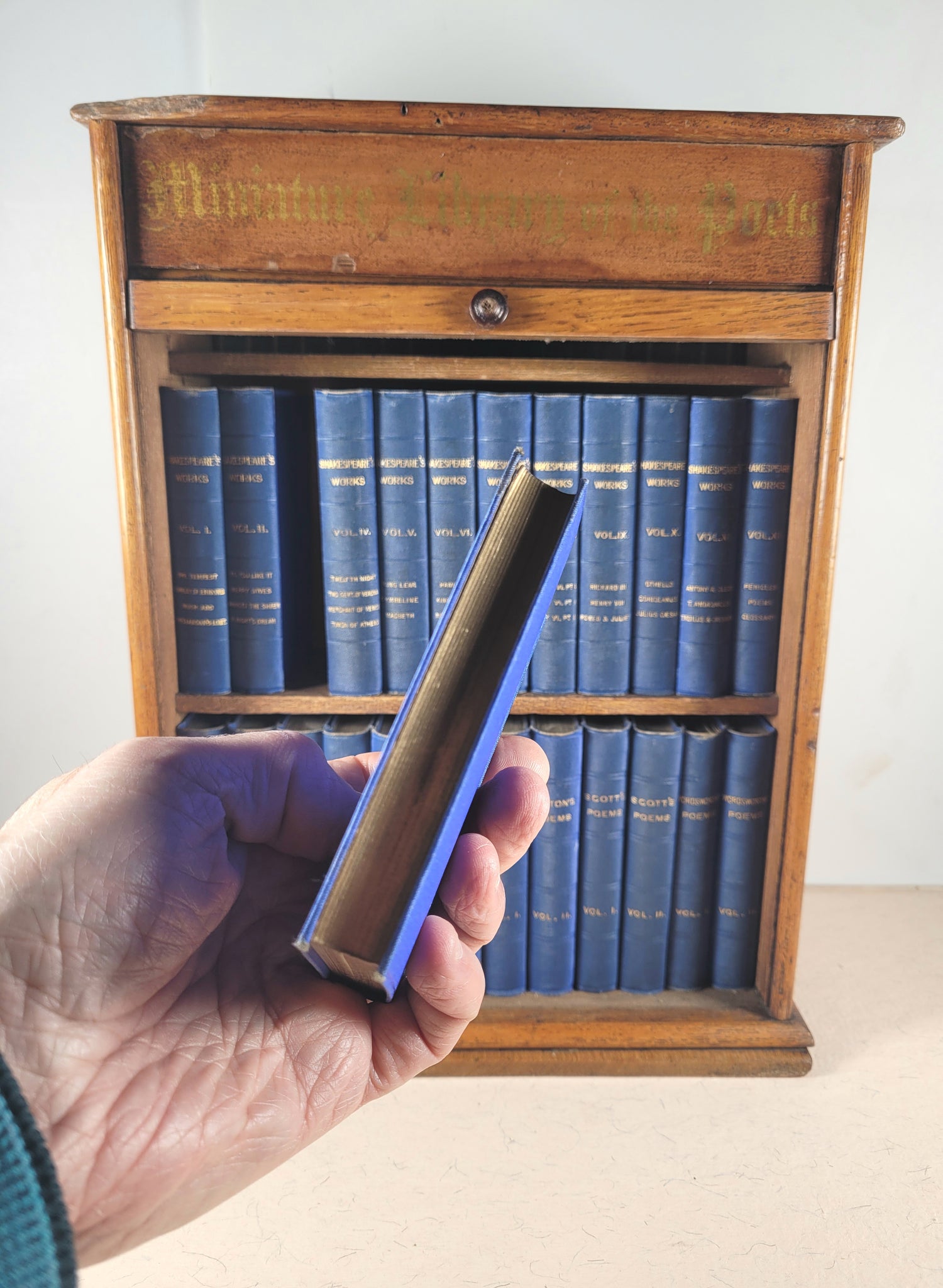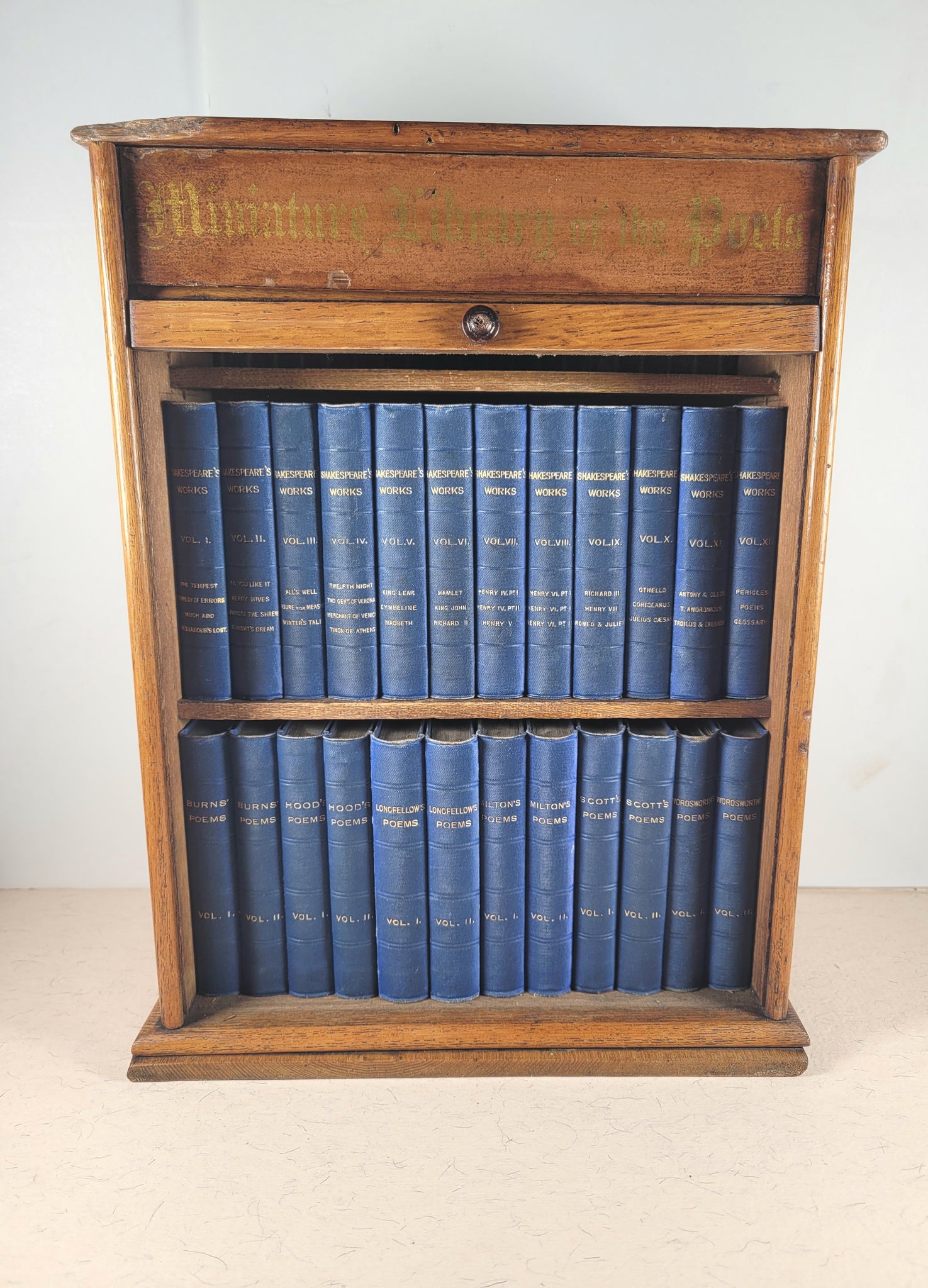 Twenty-four near miniature hardback volumes in wooden oak case and original black hand-stencilled title "Miniature Library of the Poets". This complete set comprises of the works of Shakespeare in 12 volumes and the poems of Burns, Hood, Longfellow, Milton, Scott, & Wordsworth each in two volumes. Some minor offsetting to preliminary pages, else pages all clean bright and tight. Book sizes each approx 7.5 x 10.5 cm. Uniformly bound in original full blue cloth with gilt lettering to spines. Single embossed border to front and back covers. All edges gilt. Decorative floral patterned endpapers. Books all clean and smart. Some minor rubbing to cloth on ends of spines. Housed in the original roll-front wooden miniature bookcase (326 x 239 x 123 mm). Polished oak wood case with single shelf and rolling tambour front shutter. Pedestal base and top, with original black lettering. In good condition with good wooden case (case in very good condition, door moves freely open and closed, corner chipped off at top left. An enchanting presentation set in its functional and attractive cabinet. It is believed that a quarter of a million of Kent's Miniature Library of the Poets were bought in five years in the 1880's; but most of those were bought in smaller sets and only a slim proportion were sold in their own presentation oak bookcases with tambour shuttered doors. Few of these beautiful miniature libraries have survived in good original condition.Twenty-four near miniature hardback volumes in wooden oak case and original black hand-stencilled title "Miniature Library of the Poets". This complete set comprises of the works of Shakespeare in 12 volumes and the poems of Burns, Hood, Longfellow, Milton, Scott, & Wordsworth each in two volumes. Some minor offsetting to preliminary pages, else pages all clean bright and tight. Book sizes each approx 7.5 x 10.5 cm. Uniformly bound in original full blue cloth with gilt lettering to spines. Single embossed border to front and back covers. All edges gilt. Decorative floral patterned endpapers. Books all clean and smart. Some minor rubbing to cloth on ends of spines. Housed in the original roll-front wooden miniature bookcase (326 x 239 x 123 mm). Polished oak wood case with single shelf and rolling tambour front shutter. Pedestal base and top, with original black lettering. In good condition with good wooden case (case in very good condition, door moves freely open and closed, corner chipped off at top left. An enchanting presentation set in its functional and attractive cabinet. It is believed that a quarter of a million of Kent's Miniature Library of the Poets were bought in five years in the 1880's; but most of those were bought in smaller sets and only a slim proportion were sold in their own presentation oak bookcases with tambour shuttered doors. Few of these beautiful miniature libraries have survived in good original condition.Twenty-four near miniature hardback volumes in wooden oak case and original black hand-stencilled title "Miniature Library of the Poets". This complete set comprises of the works of Shakespeare in 12 volumes and the poems of Burns, Byron, Longfellow, Milton, Scott, Sheridan & Goldsmith, each in two volumes. Some minor offsetting to preliminary pages, else pages all clean bright and tight. Book sizes each approx 7.5 x 10.5 cm. Uniformly bound in original full blue cloth with gilt lettering to spines. Single embossed border to front and back covers. All edges gilt. Decorative floral patterned endpapers. Books all clean and smart. Some minor rubbing to cloth on ends of spines. Housed in the original roll-front wooden miniature bookcase (326 x 239 x 123 mm). Polished oak wood case with single shelf and rolling tambour front shutter. Pedestal base and top, with original black lettering. In very good condition with very good wooden case (case in very good condition, door moves freely open and closed). An enchanting presentation set in its functional and attractive cabinet. It is believed that a quarter of a million of Kent's Miniature Library of the Poets were bought in five years in the 1880's; but most of those were bought in smaller sets and only a slim proportion were sold in their own presentation oak bookcases with tambour shuttered doors. Few of these beautiful miniature libraries have survived in such original condition. Seller Inventory