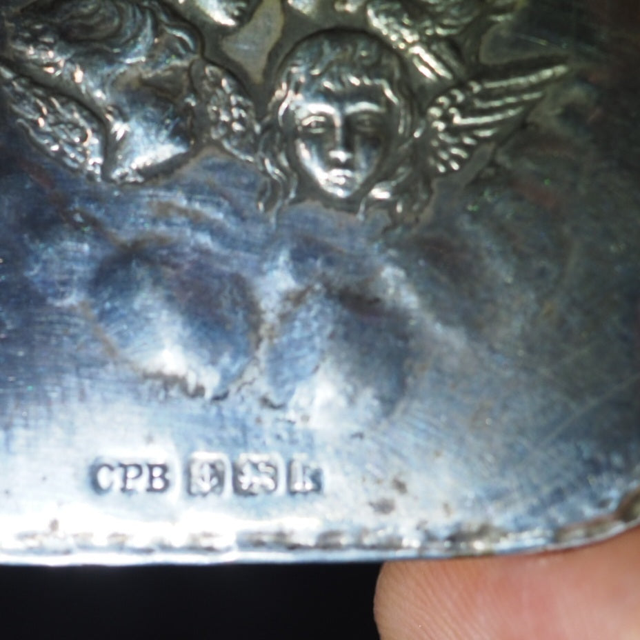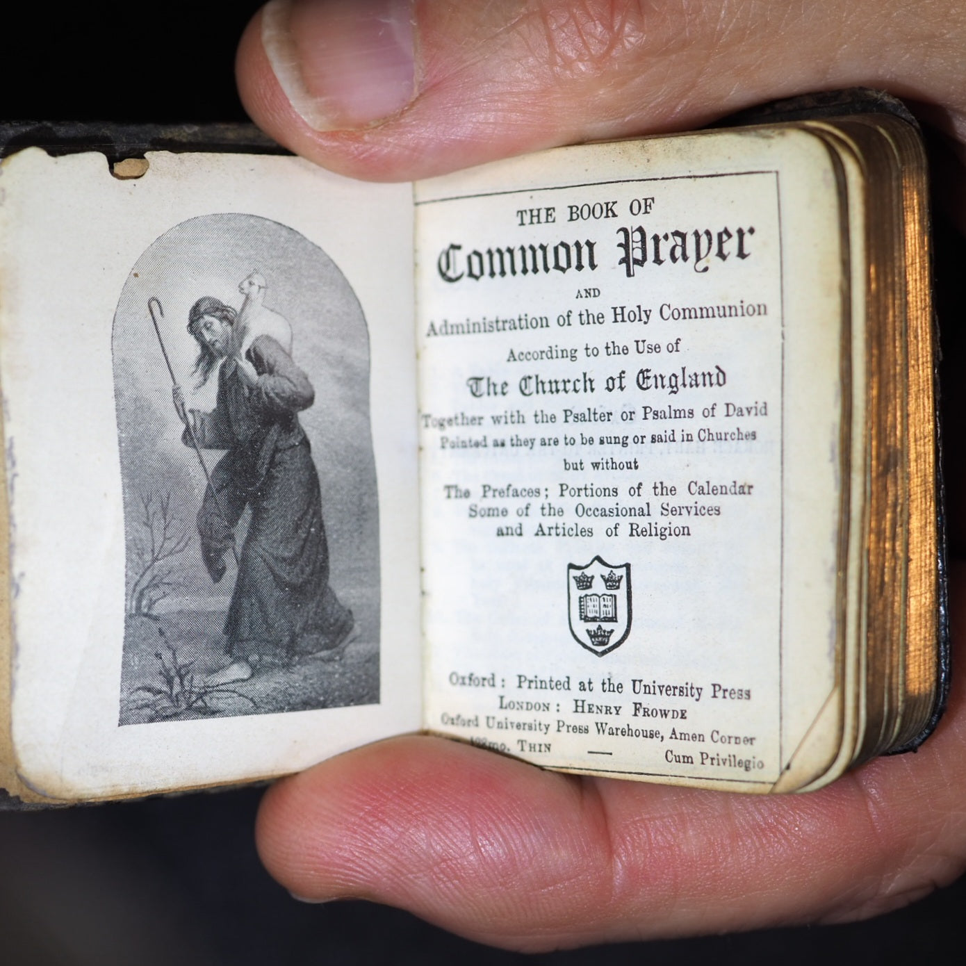 Book of Common Prayer and Administration of the Holy Communion According to the Use of the Church of England. Oxford University Press Warehouse, Amen Corner. Henry Frowde. London. 1898. [1898]. Diamond 128mo. 688 printed pages. Thin India paper. Silver Reynold's Angels front plaquette. Fully hallmarked for Birmingham, 1909/10. Charles Penny Brown was the Birmingham Silversmith. Rounded corners. Original black endpapers (some edge wear). All edges gilt. Contemporary ink inscription on verso of front free endpaper, dated 1910. 48 x 56 mm. Original black morocco, with gilt titling on spine (slightly rubbed along hinges and at edges). Henry Frowde was manager of the London office of Oxford University Press until 1913. Welsh, 1856. 48 firsts2024