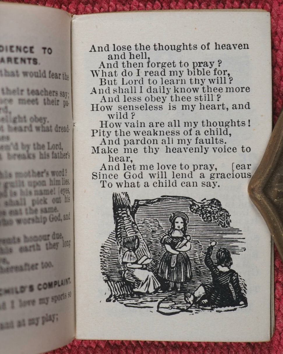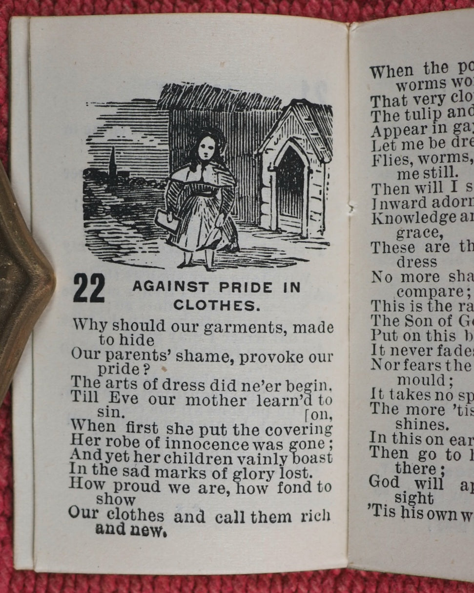 48 printed pages. 12 woodcut engraved vignettes. Some very slight browning. Title page with slight wear. 40 x 65mm. Original black glossy paper covers. Upper cover slightly creased with edge wear and very small losses at outer corners. Bondy described T.Goode's miniature books as "still difficult to find are the many volumes in original black wrappers" but does not identify this title. Not in Bondy, nor Gumuchian, nor Spielmann. Welsh, 7059. OCLC, 234086034. WorldCat locates 3 copies worldwide (Victoria & Albert Museum, UCLA, and an incomplete copy at the University Library of Virginia). Isaac Watts' Divine and Moral Songs had become a miniature book title that had been in demand since 1790 - this edition is very scarce.