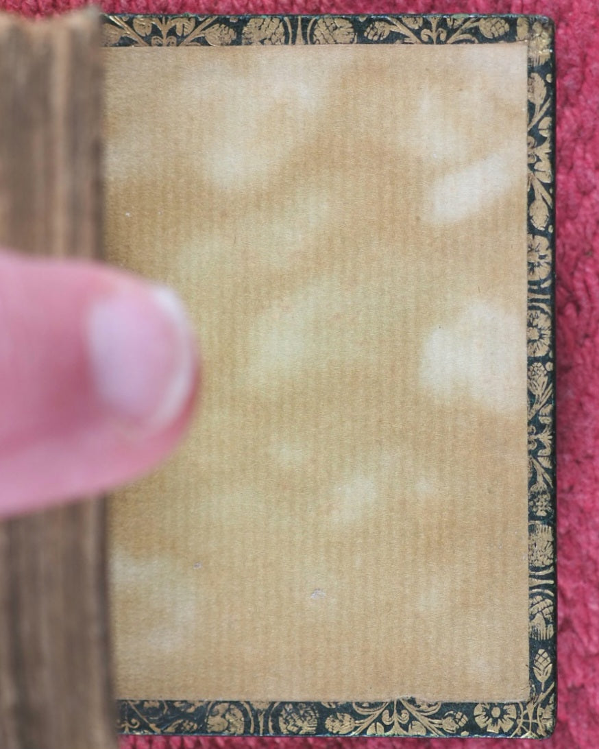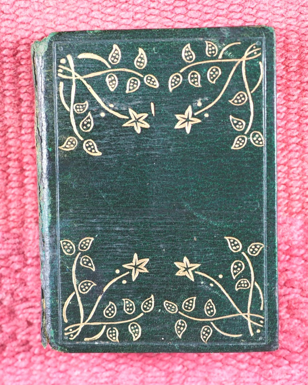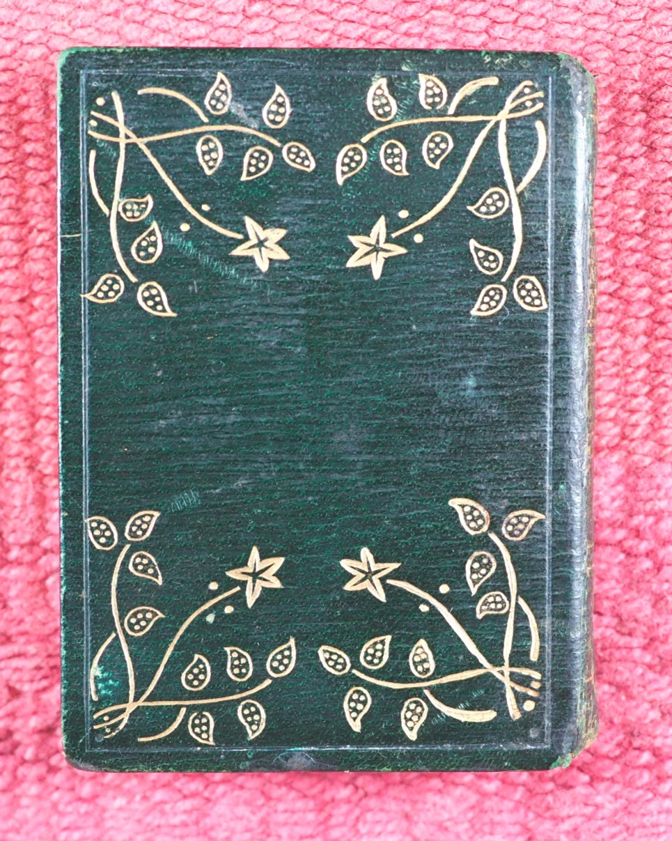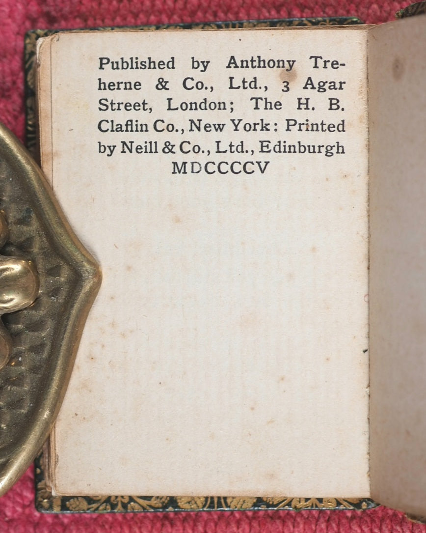 127 [1] printed pages. Waistcoat Pocket Classics. "Printed by Neill & Co., Ltd. Edinburgh"-Colophon. Inner gilt dentelles. All edges gilt. Original mottled endpapers. Age-toned leaves and some brown spotting. One gathering very slightly sprung. 42 x 64mm. Original straight-grained green morocco. Gilt title and decoration on spine; covers with gilt Art Nouveau floral decoration. Spine rubbed. Upper hinge weak and cracked. Welsh, 4804. OCLC, 557407904. WorldCat locates eleven copies worldwide.