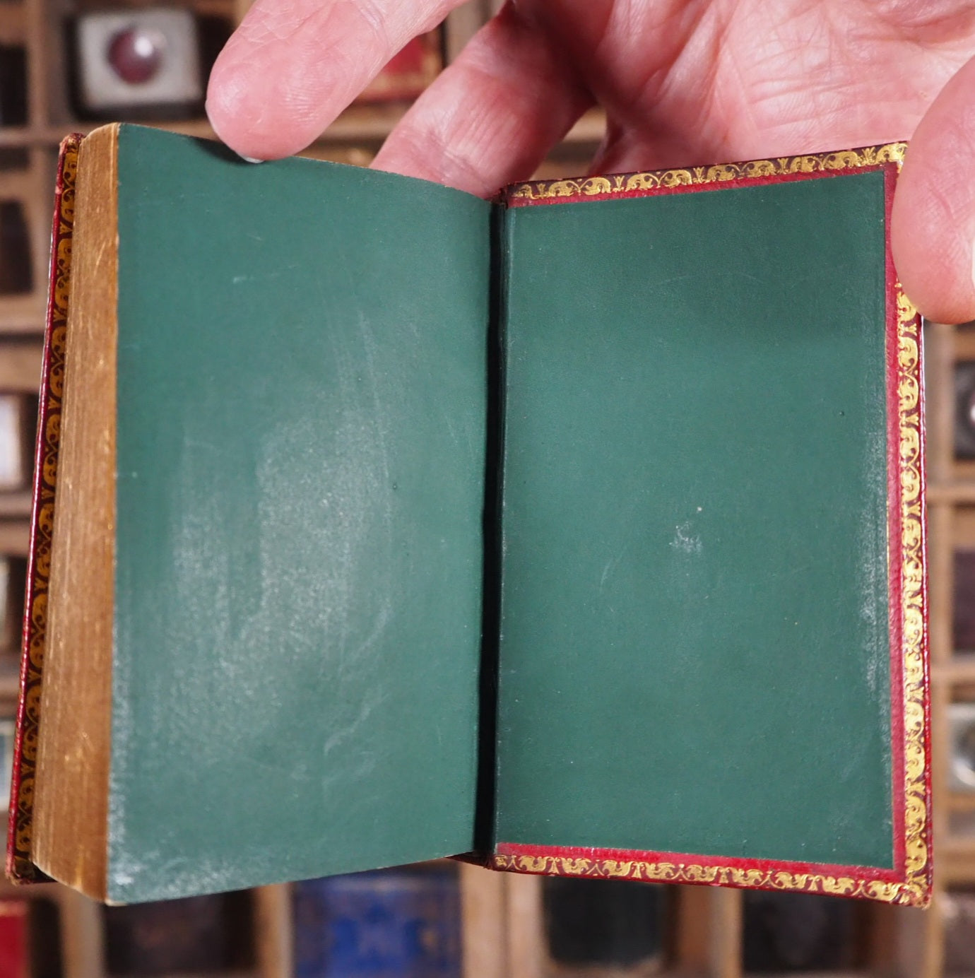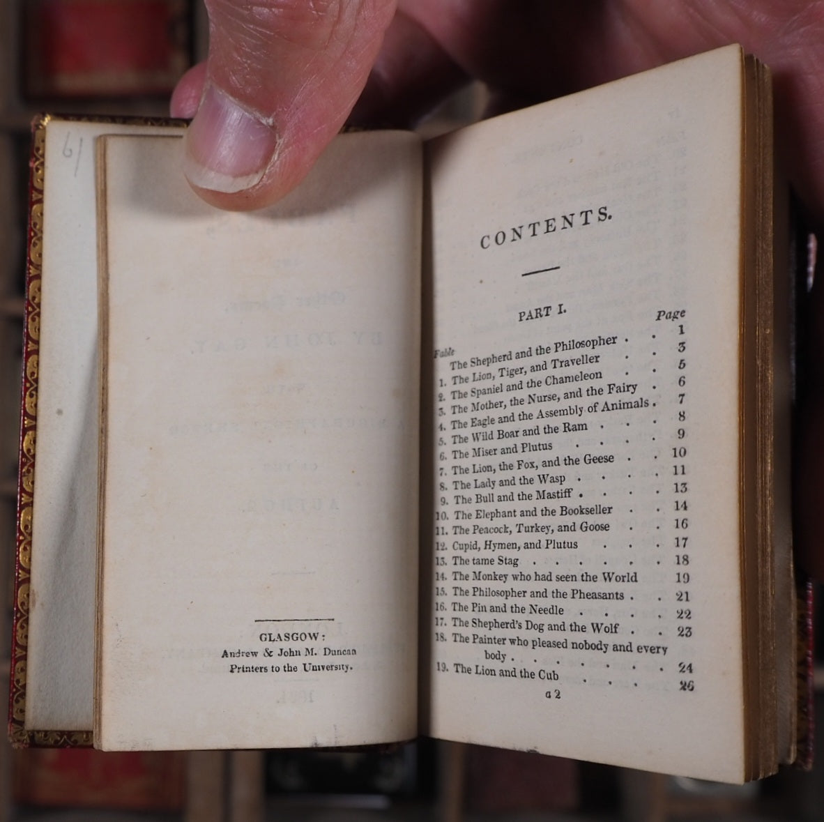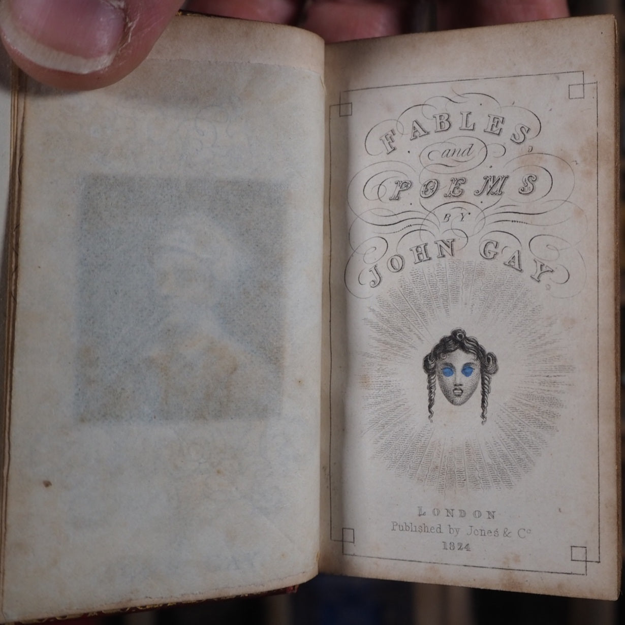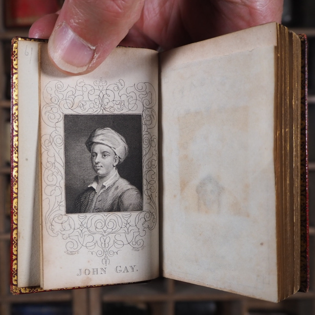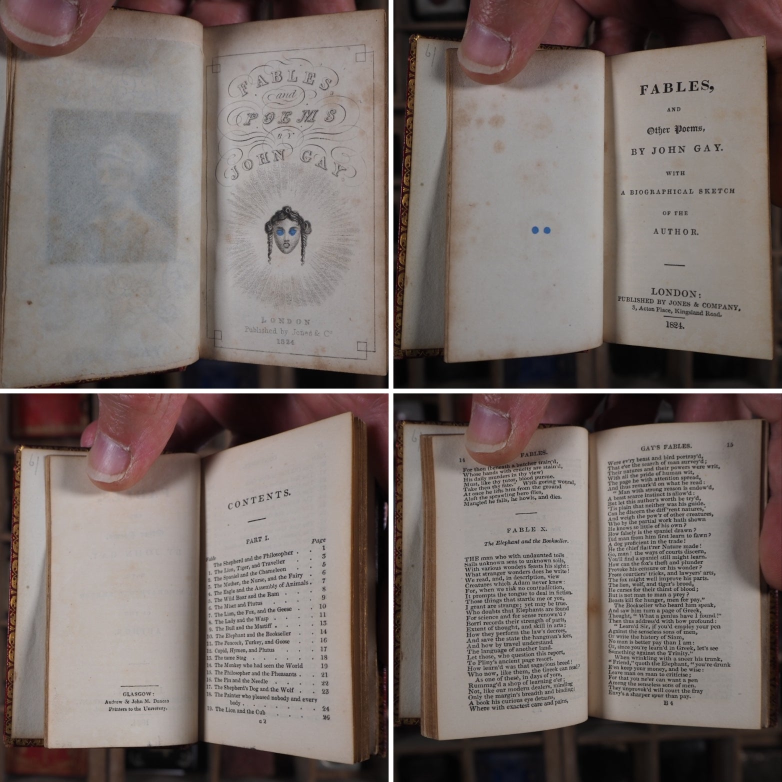xxi, 216 printed pages (very mild sporadic foxing). With a life of John Gay by Dr. Johnson at the beginning. Engraved additional title page and portrait frontispiece. Inner gilt dentelles. Original forest green endpapers. All edges gilt. 58 x 92mm. Contemporary maroon morocco cathedral binding (slightly rubbed along hinges and at the head of the spine). Title lettering in gilt on spine. One of the 39 titles in the Jones's Diamond Poets series. Gothic revival cathedral style of binding that is not so common in miniature books of the early nineteenth century, particularly in books the are not directly related to the Christian faith. Fable 10 is entitled The Elephant and the Bookseller: a wise elephant is browsing in a bookshop, taking books from the shelves to read them, from Greek literature to Natural History, but dismissing them as inaccurate; the elephant is overheard by the Bookseller, who with excitement bows to the elephant and begs him to take up his pen and share his wisdom; the elephant scornfully replies as he leaves the bookshop: "When wrinkling with a sneer his trunk, Friend, quoth the Elephant, you're drunk". A second edition by Jones was published 7 years after this. Bondy, 84-5. Spielmann, 243 (1831 edition). Welsh, 2952. WorldCat locates four copies of this earlier edition. Seller Inventory # 5324