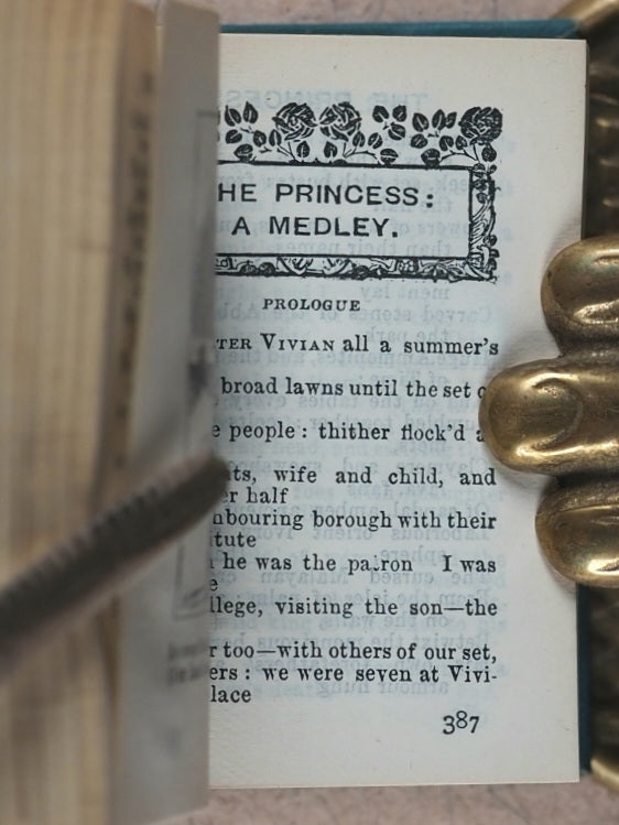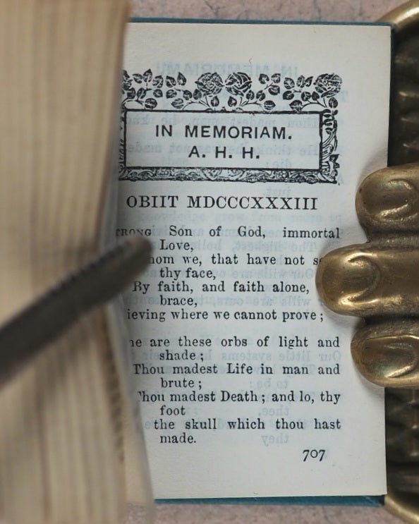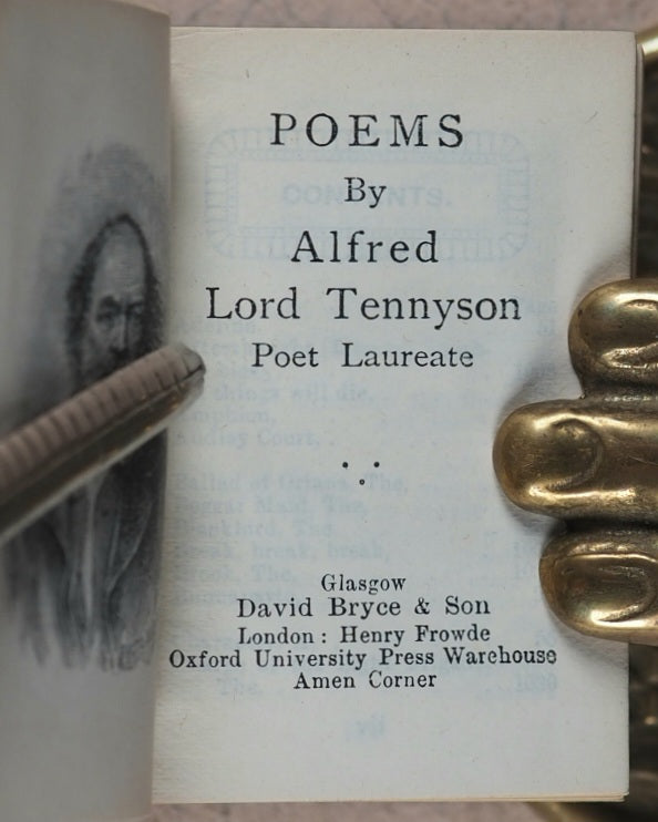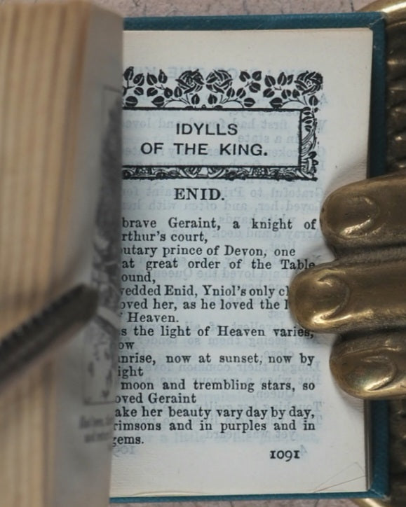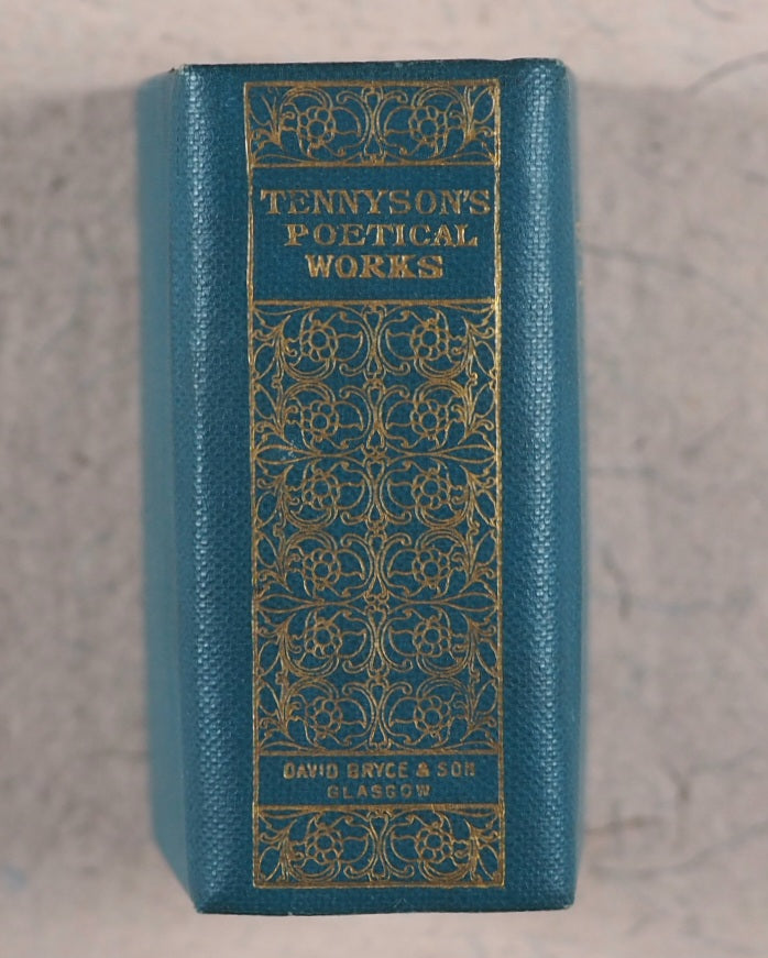 xiv, 1472 printed pages. Original paper wrappers, printed 'TENNYSON' reversed on black borders. Each section is opened with a black & white illustration. Bryce published in 1905 a four-volume edition of Tennyson, which was followed by, or published simultaneously with, this one-volume edition. 34 x 53 mm. Original light blue cloth. Elaborate gilt decoration and titling on spine and gilt titling only on front cover. Bondy refers to this edition as "rare." Garbett, 38. Bondy, 115. Welsh, 6652. OCLC, 42471099. WorldCat locates 6 copies worldwide.
