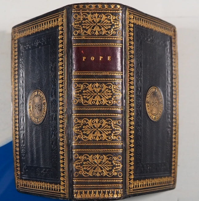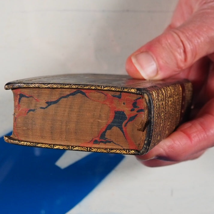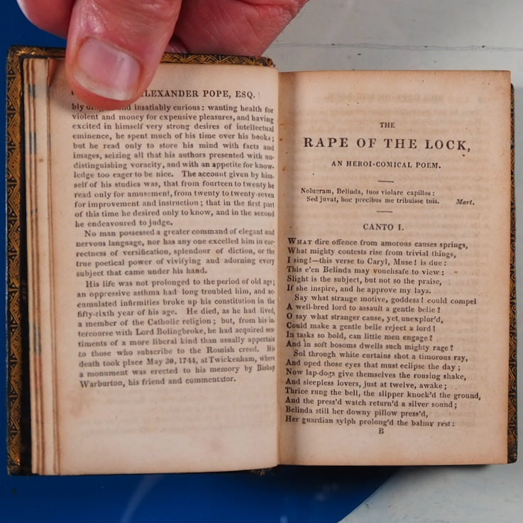 BRITISH POETS CABINET EDITION. Near miniature. iv, 508 printed pages (evenly age-toned). Printed area 55 x 90 mm. Engraved title page -with W.Cole as stated publisher-and engraved portrait frontispiece (with small tear). All edges marbled. Marbled endpapers. Contemporary owner's signature on verso of front free endpaper, and owner's blind embossed cipher on following two blank leaves. Inner gilt dentelles. 70 x 106 mm. Contemporary blue calf. Spine elaborately hand tooled in gilt with four compartments of floral swags within pointille horizontal and single fillet borders; burgundy morocco titling-piece with gilt lettering. Covers elaborately blind stamped around gilt central circular medallion entitled "British Poets Cabinet Edition", all within hand tooled double fillet and scrolling floral gilt borders (corners, edges and hinges very slightlly rubbed). No copies of this exact edition have been located in WorldCat. Seller Inventory # 5260