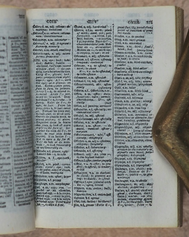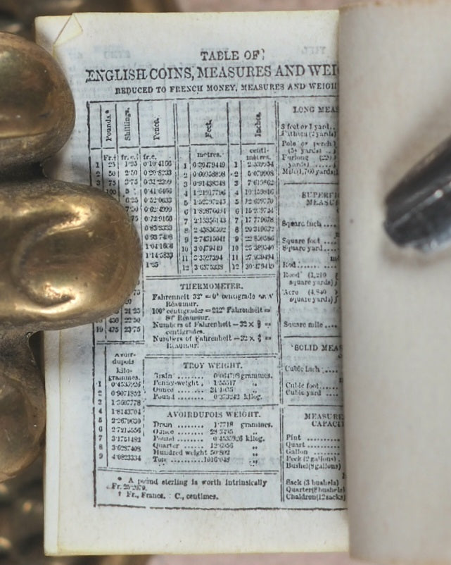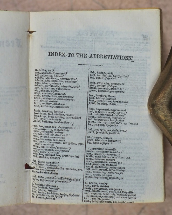 vii,648 (1) printed pages in French. Printed on fine india paper. Photo reduction technique employed to produce text in three columns. Last printed page covers English coins and measurements. Yellow edges (toned). Yellow endpapers. 21 x 28 mm. Original maroon leather, with gilt titles to the front . 'PEARS. SAVON. SOAP' on back cover. Complete with original metal case in unusually good condition with magnifier and loop at top. Barely any rubbing and discolouration to the outside of the case which inside is brighter silver. Contains more than 5,000 words, sentences and idiomatic phrases. Considering the size of the print, it is unexpectably readable with the magnifier. This famous publishing firm was started in 1832 in Glasgow, Scotland and went into miniature books from 1876 until 1913, when it permanently closed down. Although thousands of these dictionaries were issued, according to Bondy, they are now becoming quite scarce and are much rarer than the Smallest English Dictionary in the World. A similar example of this book is in Her Majesty Queen Mary's Dolls' House Library at Windsor Castle. Bondy, 107. Garbett, 26. Pistner, B233:8. Spielmann, 162. Welsh, 2425.