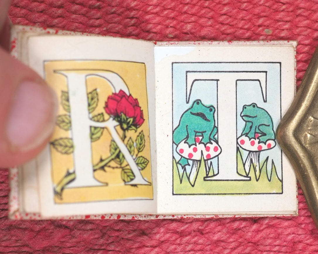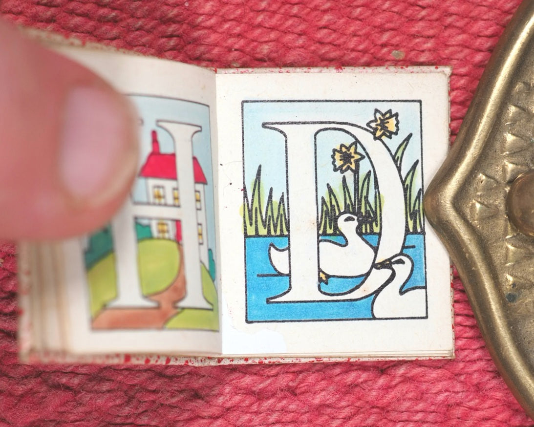 She drew each page twice-up (twice the size of the finished book). These pages were printed on to sheets and then reduced. All the colour work was hand-done with felt tip pens. The pages were cut out by Jane with a scalpel, collated and then stapled together. The covers, which are just like those on hardback books, on a tiny scale, were made separately. Because these exquisite miniature books were hand-made, supply was limited and they are now collectable.