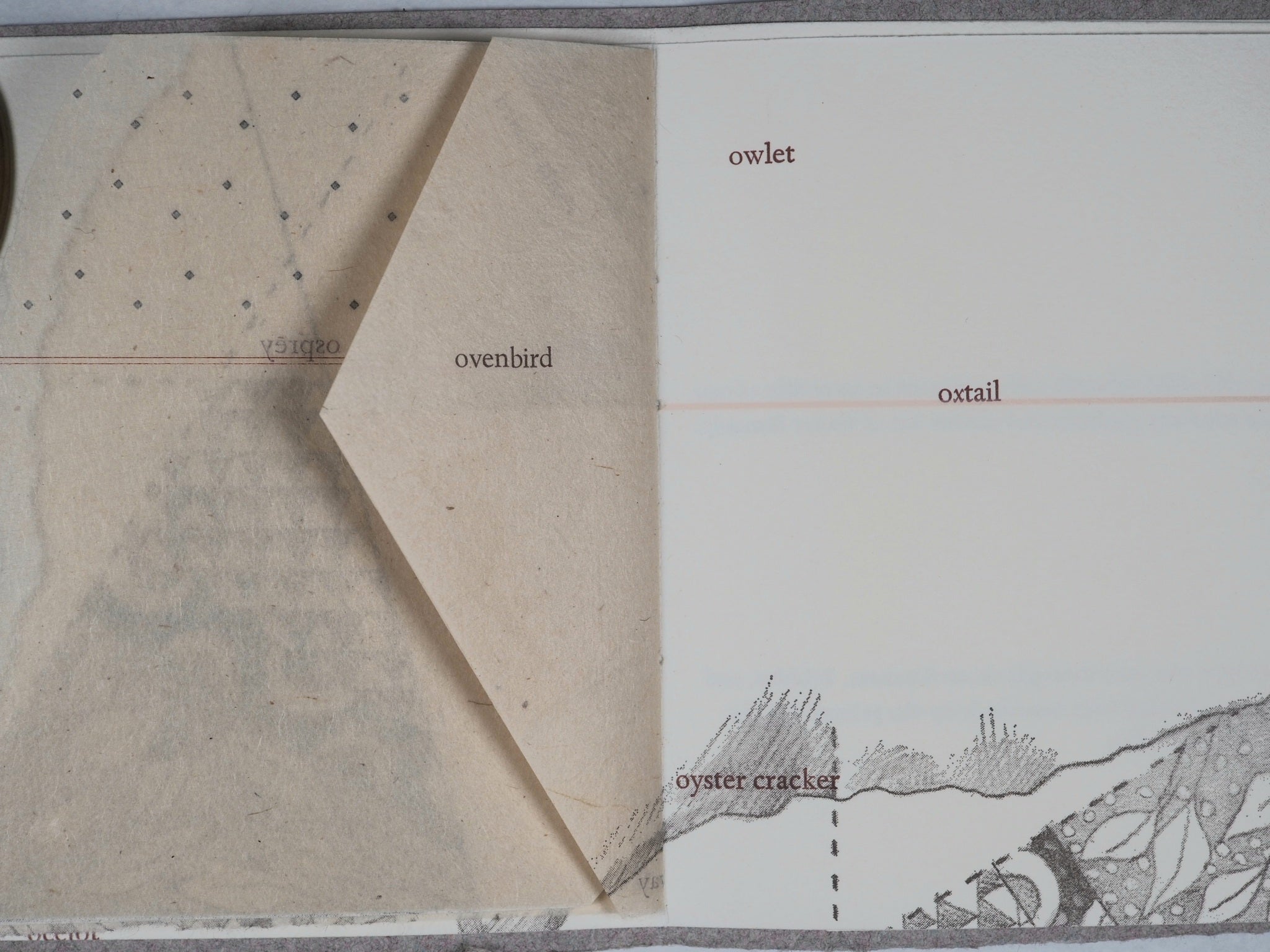 24 pages that feature fold-outs, flaps, and shaped edges. All of the words in the text begin with the letter 'o.' "This vast well of information was completed in early May of 1980 under the scholarly guidance and nimble wit of Walter Hamady. Spectrum type was used throughout on Kitikata, Sekishu, and Rives papers; Covers were handmade by the printer and the amazing Walter Tisdale. In an edition of 25 this is number 109 x 116 mm. Soft folded cover sewn to single signature. Joan Flasch Artists' Book Collection. Barbara Tetenbaum and Walter Tisdale are UW-Madison alumni. OCLC 7728092. WorldCat records three copies worldwide (Chicago, Vermont Howe, Wisconsin). The illustrations were created using stencils, string, and other found objects during the printing process. This hands-on, experimental approach to image-making is a hallmark of the artist's style and a key feature of the book's visual appeal. Tetenbaum designed the book to direct the reader's gaze to different locations on the pages. This challenges the conventional, linear act of reading and encourages the reader to physically interact with the book, making them an active participant in the experience. The work features musings on both Tetenbaum herself and her father, adding a layer of personal narrative to the abstract and structural experiments. Published under Tetenbaum's Triangular Press imprint in 1980, this is an early work by an artist who has since become a key figure and influential educator in the contemporary book arts field.